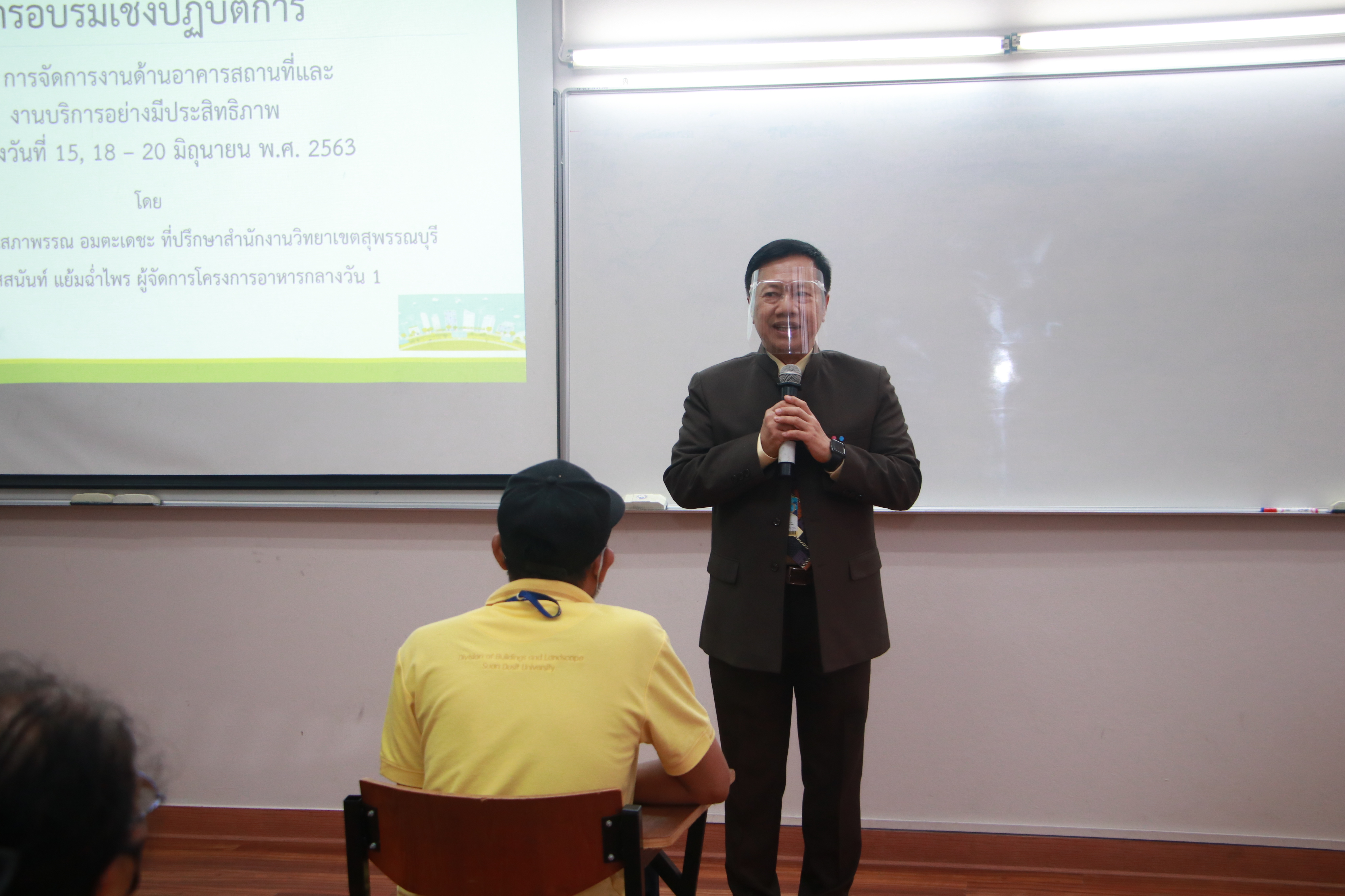 ผู้ช่วยศาตราจารย์ ดร.พิทักษ์ จันทร์เจริญ รองอธิการบดีฝ่ายบริหาร มหาวิทยาลัยสวนดุสิต เป็นประธานเปิดการอบรมเชิงปฏิบัติการ เรื่องการจัดการงานด้านอาคารสถานที่และงานบริการอย่างมีประสิทธิภาพ และนายพรรษวัชร อุดมเสฏฐ์ชัย ผู้อำนวยการกองอาคารและสถานที่ กล่าวรายงานวัตถุประสงค์การจัดงาน โดยได้รับเกียรติจากวิทยากรร่วมบรรยายให้ความรู้ ดังนี้ เรื่องระบบคุณภาพกับงานบริการ โดย ผู้ช่วยศาตราจารย์โสภาพรรณ อมตะเดชะ ที่ปรึกษาสำนักงานวิทยาเขตสุพรรณบุรี และอาจารย์พัสสนันท์ แย้มฉ่ำไพร ผู้จัดการโครงการอาหารกลางวัน 1 , เรื่อง มาตรฐานการบริการในความเป็นสวนดุสิต โดย ผู้ช่วยศาตราจารย์โสภาพรรณ อมตะเดชะ ที่ปรึกษาสำนักงานวิทยาเขตสุพรรณบุรี จากนั้นมีการสาธิตและฝึกปฏิบัติด้านบุคลิกภาพ และมารยาทในการให้บริการ ด้านการบำรุงรักษาและการทำความสะอาดวัสดุและเครื่องมือเครื่องใช้ และด้านการทำความสะอาดประจำวัน และการทำความสะอาดใหญ่ในพื้นที่ต่างๆ โดยการอบรมเชิงปฏิบัติการเรื่องการจัดการงานด้านอาคารสถานที่และงานบริการอย่างมีประสิทธิภาพ จัดขึ้นระหว่างวันที่ 15, 18 – 20 มิถุนายน พ.ศ. 2563 ณ ห้อง 13304 ชั้น 3 อาคาร 13 มหาวิทยาลัยสวนดุสิต