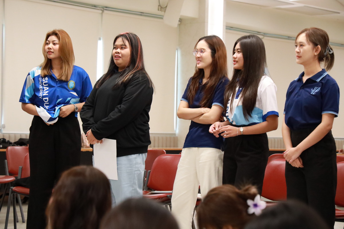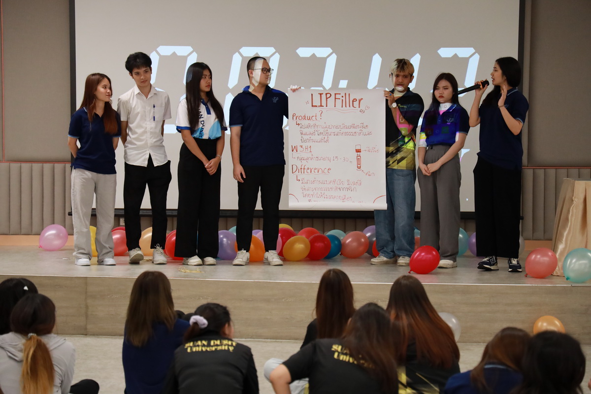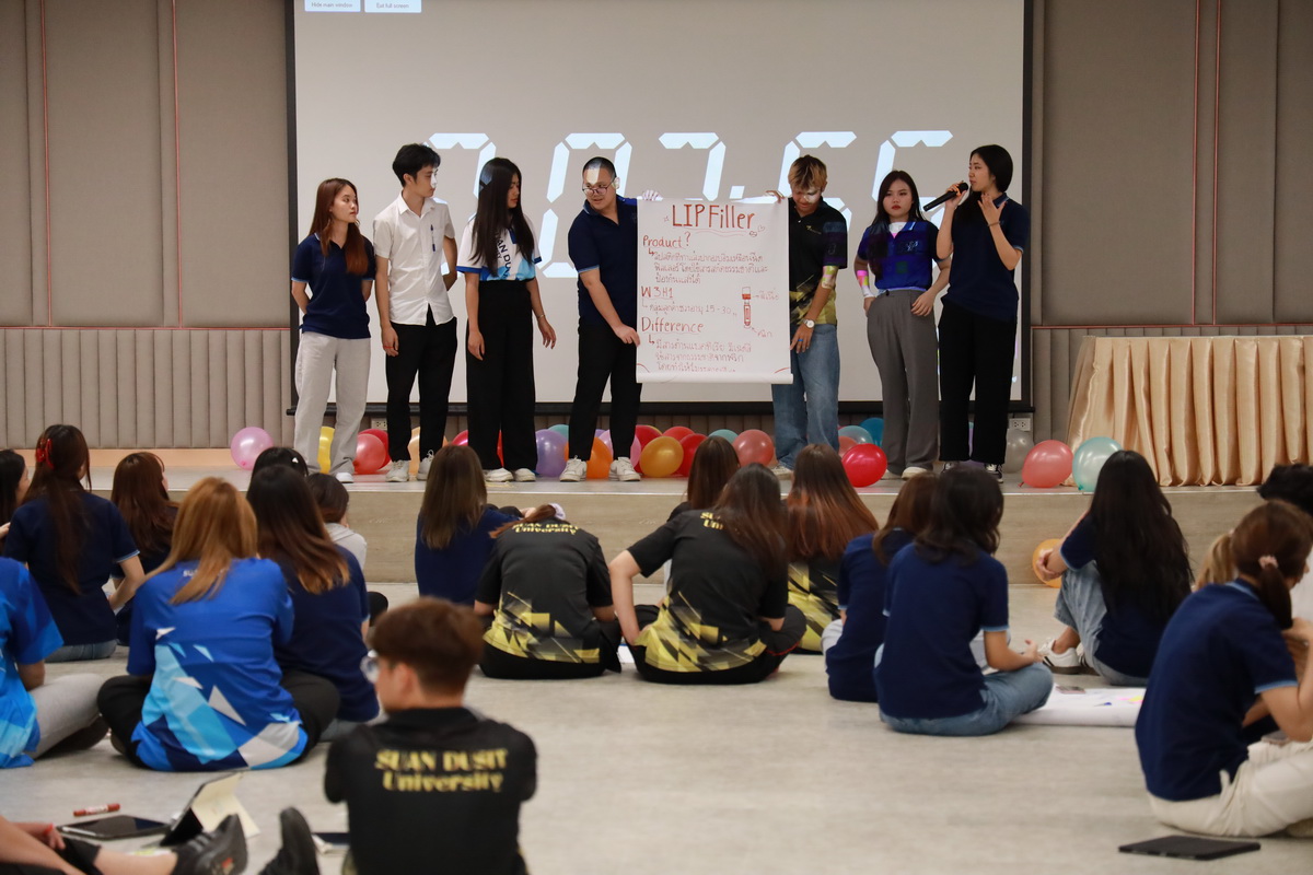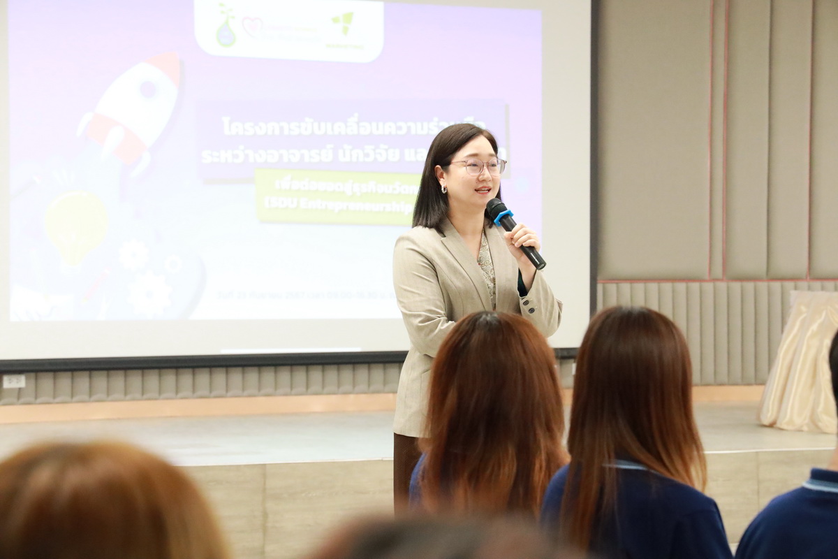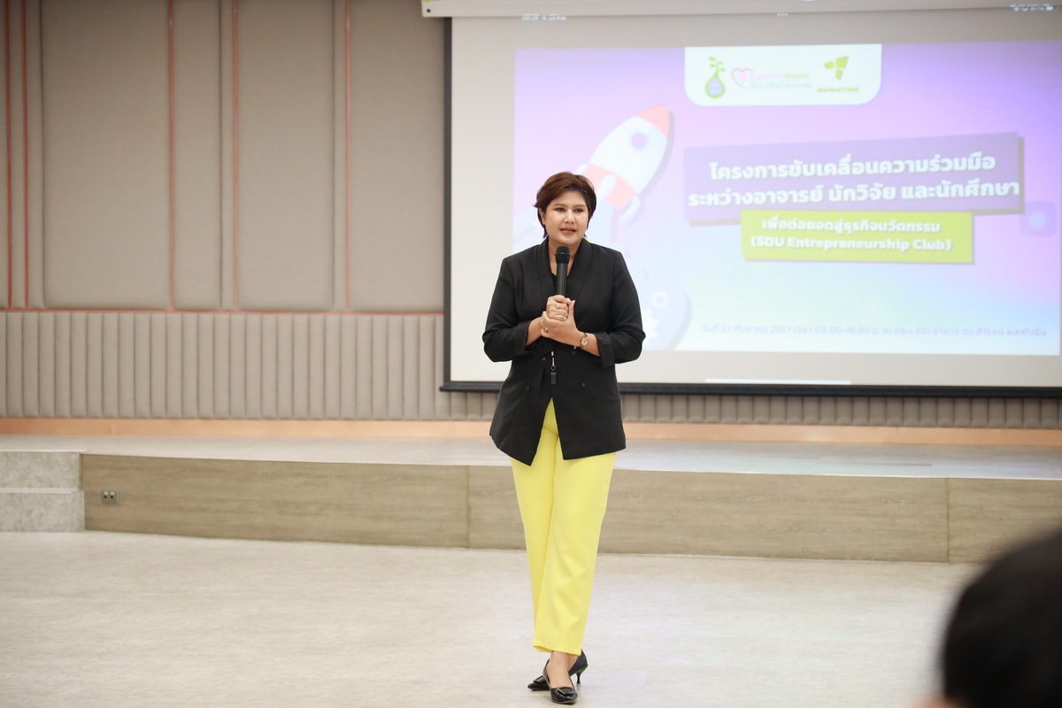 คุณอกนิษฐ์ เลิศสิริศรีสกุล ผู้จัดการหน่วยบ่มเพาะวิสาหกิจ มหาวิทยาลัยสวนดุสิต กล่าวรายละเอียดกิจกรรมโครงการขับเคลื่อนความร่วมมือระหว่างอาจารย์ นักวิจัย และนักศึกษา เพื่อต่อยอดสู่ธุรกิจนวัตกรรม (SDU Entrepreneurship Club) ซึ่งมีกิจกรรมต่างๆ เช่น กิจกรรมละลายพฤติกรรม “เปิดตัว เปิดใจ ยอมรับ” (Ice Breaking) ยอมรับ โดย คุณไพศาล คงสถิตสถาพร ผู้อำนวยการกองประชาสัมพันธ์ มหาวิทยาลัยสวนดุสิต คุณอลิศ พันธ์พรสม กองประชาสัมพันธ์ มหาวิทยาลัยสวนดุสิต ต่อมาเป็นการนำเสนอแนวคิดธุรกิจเครื่องสำอาง โดย ผู้ช่วยศาสตราจารย์โรจนา ศุขะพันธุ์ วิทยากรด้านบริหารธุรกิจ คุณอกนิษฐ์ เลิศสิริศรีสกุล ผู้จัดการหน่วยบ่มเพาะวิสาหกิจ มหาวิทยาลัยสวนดุสิต เมื่อวันที่ 23 กันยายน 2567 ณ ห้อง 301 ชั้น 3 อาคาร ดร.ศิโรจน์ ผลพันธิน