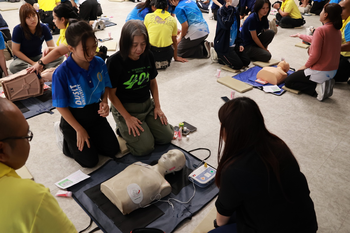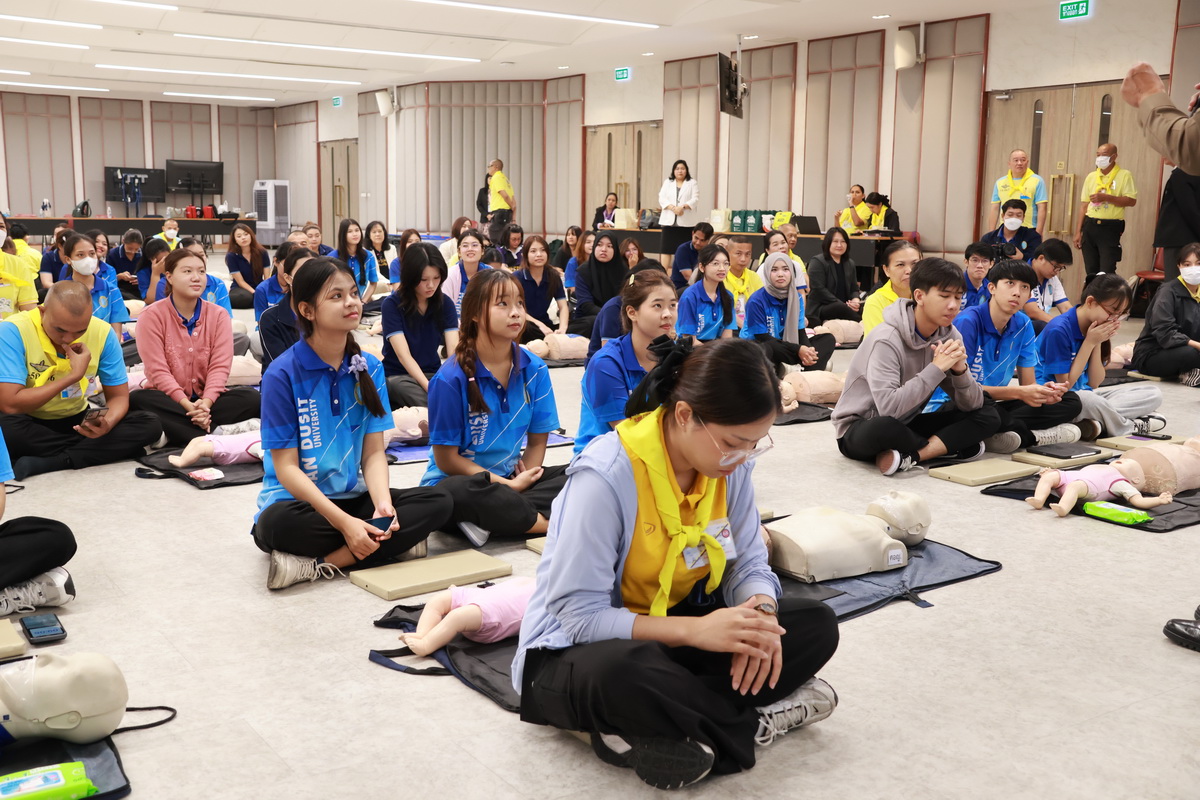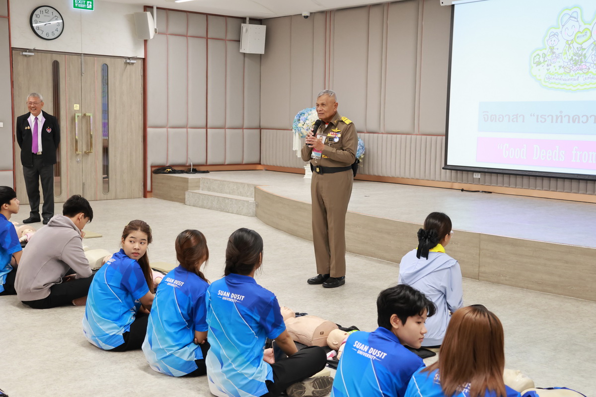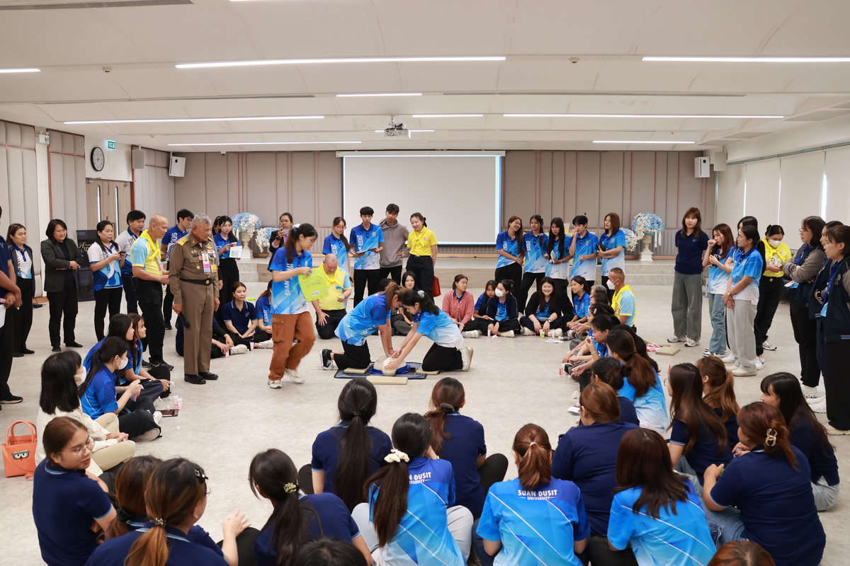 มหาวิทยาลัยสวนดุสิต ร่วมกับ ศูนย์อำนวยการใหญ่จิตอาสาพระราชทาน และมูลนิธิหัวใจแห่งประเทศไทย ในพระบรมราชูปถัมภ์ จัดโครงการ “การฝึกอบรมการช่วยชีวิตขั้นพื้นฐานเฉลิมพระเกียรติสมเด็จพระกนิษฐาธิราชเจ้า กรมสมเด็จพระเทพรัตนราชสุดาฯ สยามบรมราชกุมารี 70 พรรษา”โดยมี รศ.พัชรี สวนแก้ว รองอธิการบดีฝ่ายกิจการนักศึกษา กล่าวต้อนรับ สำหรับการฝึกอบรมภาคทฤษฎี และภาคปฏิบัติ ได้รับเกียรติจาก พลอากาศเอกสุบิน ชิวปรีชา กรมวังผู้ใหญ่ในพระองค์ 904 และทีมวิทยากรจากศูนย์อำนวยการใหญ่จิตอาสาพระราชทาน (ศอญ.จอส.พระราชทาน) บรรยายในหัวข้อ การฝึกการช่วยเหลือภาวะทางเดินหายใจอุดกั้น (Chocking) การช่วยฟื้นคืนชีพขั้นพื้นฐาน (CPR)การใช้เครื่องกระตุกหัวใจไฟฟ้าชนิดอัตโนมัติ (AED) ณ ห้อง 301 อาคาร ดร.ศิโรจน์ ผลพันธิน ศูนย์พัฒนาทุนมนุษย์ มหาวิทยาลัยสวนดุสิต เมื่อวันที่ 25 มีนาคม 2568
