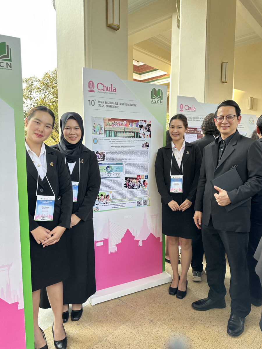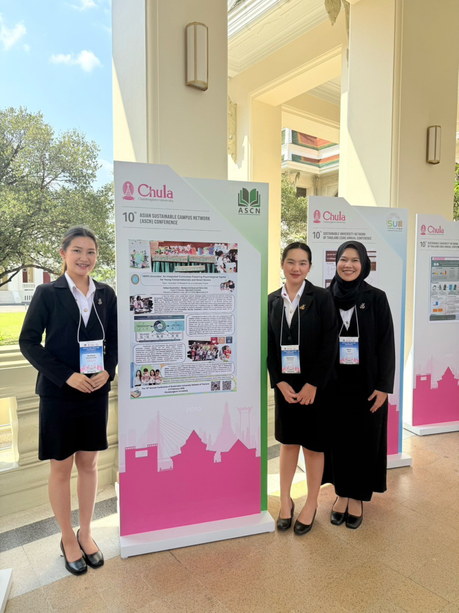 Three third-year students from the Bachelor of Education Program in Early Childhood Education—Ms. Nisreen Leeka, Ms. Warisara Intawat, and Ms. Natthaya Siaophukiao—were selected to present their poster in the “Innovation & Research for a Sustainable Future” category. Their project, titled “HERO Innovator: An Integrated Curriculum Fostering Psychological Capital for Young Conservationists and Smart Savers,” was developed as part of the University Student Project Competition 2025.