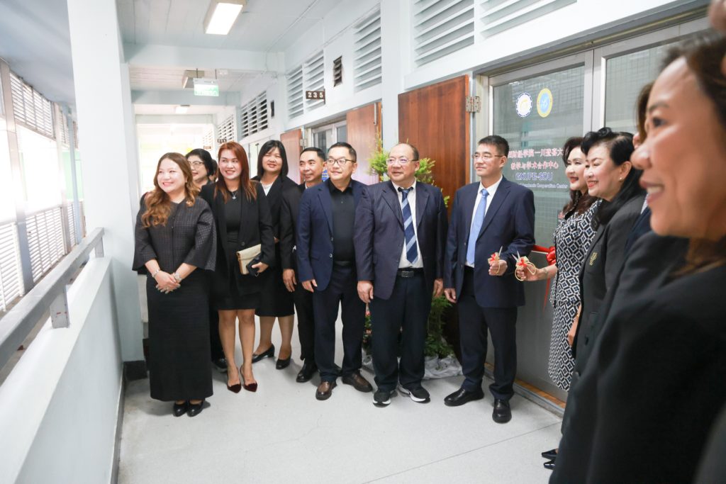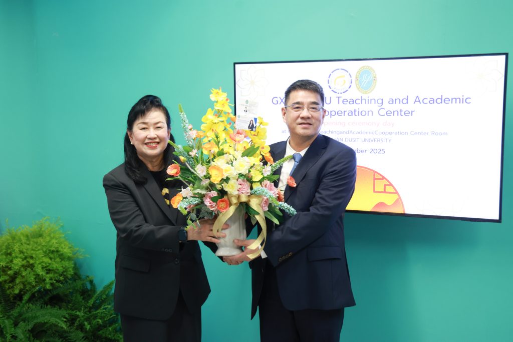 The inauguration took place on the 3rd floor of Building 2 at Suan Dusit University, attended by senior executives from both institutions. Asst. Prof. Dr. Pornchanit Kaew-nate, Vice President for Academic and International Affairs at SDU, delivered the keynote address outlining the vision and strategic objectives behind the center’s establishment. Representing GXUFE, Vice President Mr. Zhu Sichang expressed his congratulations and emphasized the profound importance of the academic friendship between the two universities. To commemorate this milestone, Dr. Waranee Vessoontorntep, Vice President for Suphan Buri Campus, and Assoc. Prof. Pacharee Suankaew, Vice President for Student Affairs, presented floral tributes in celebration of the partnership.