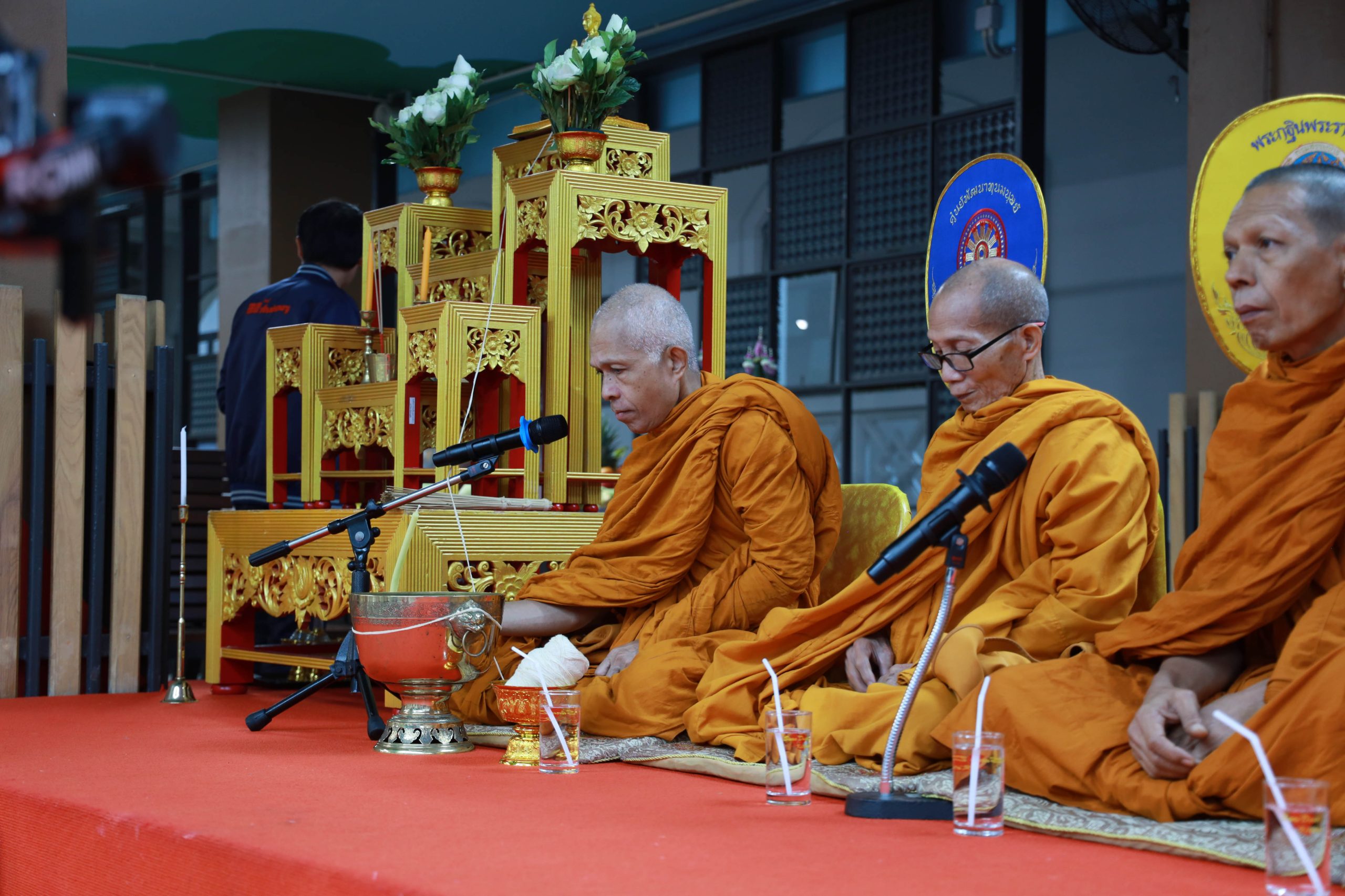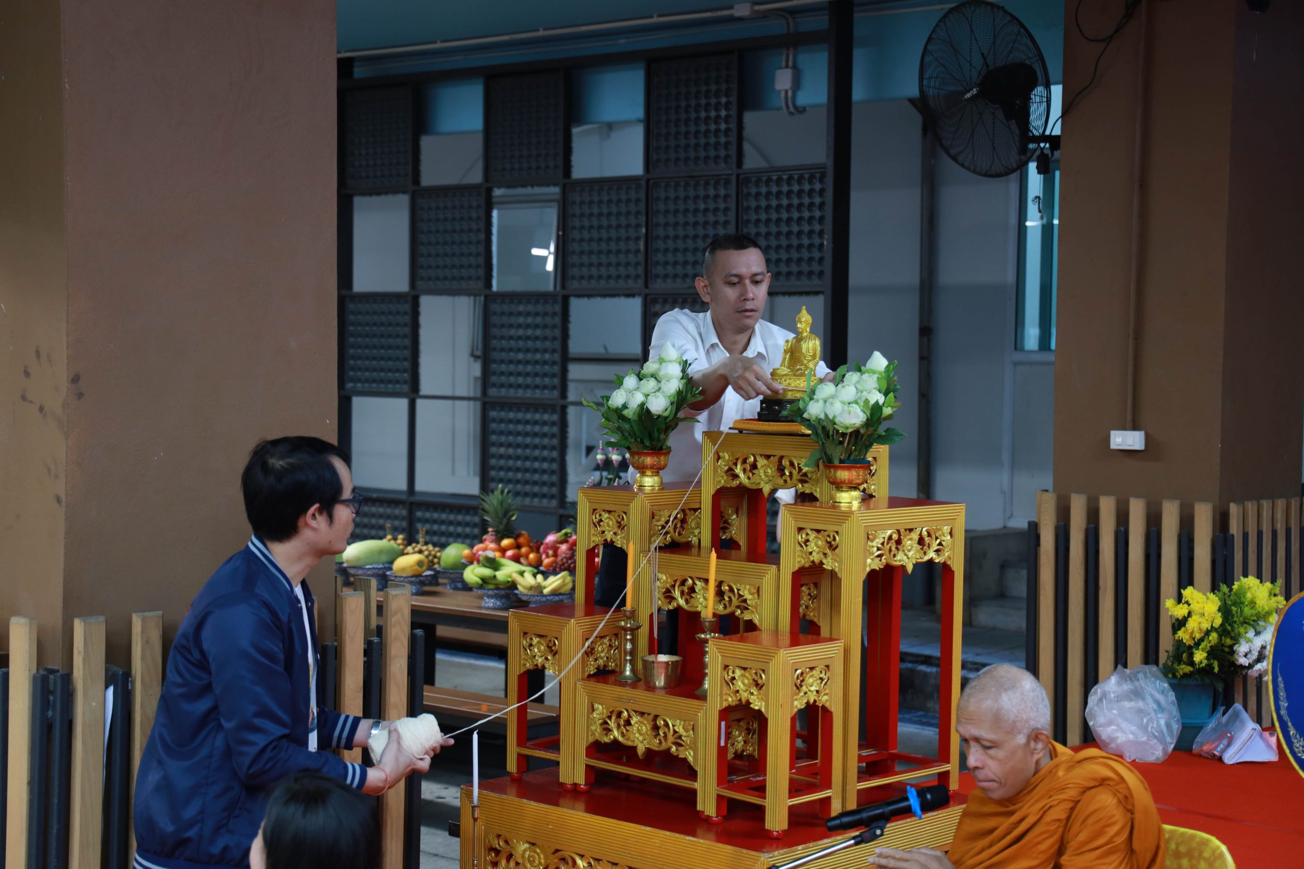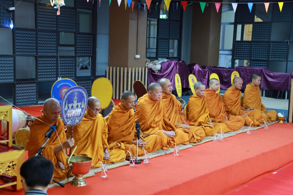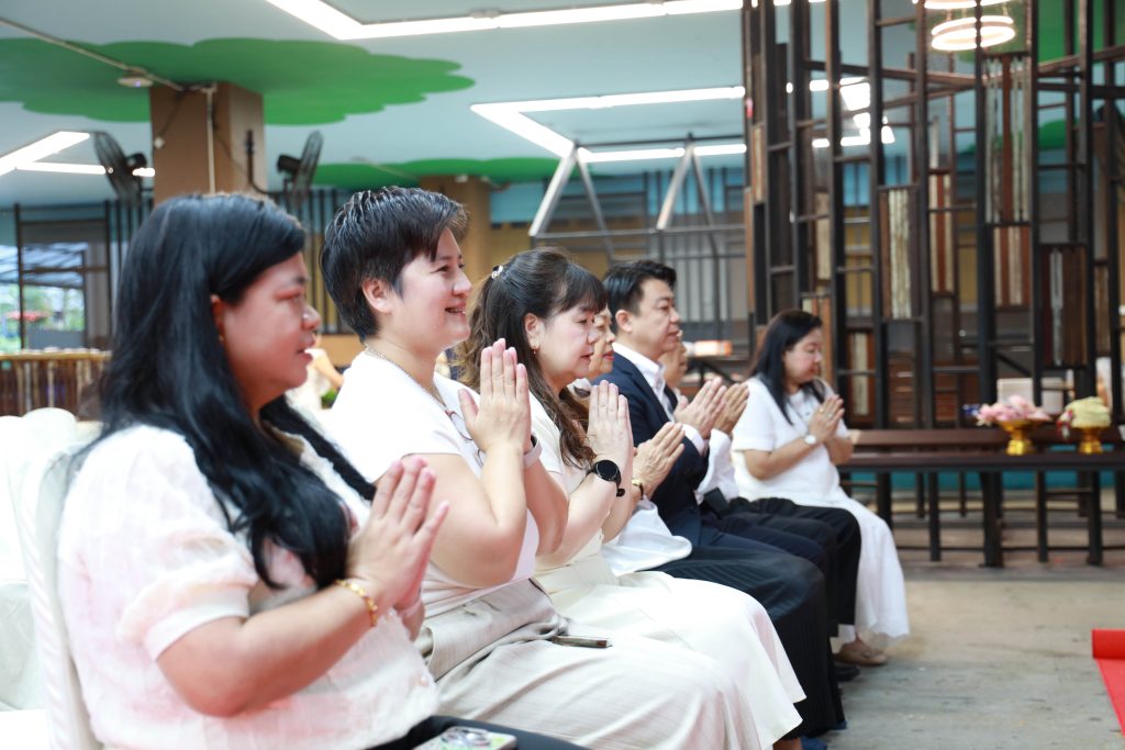 The ceremony began with the Buddhist rites, presided over by Assoc. Prof. Dr. Yutthapong Leelakitpaisarn, Dean of the Faculty of Humanities and Social Sciences, who lit incense and candles to pay homage to the Triple Gem. Faculty members and participants jointly offered breakfast and traditional requisites to the monks.