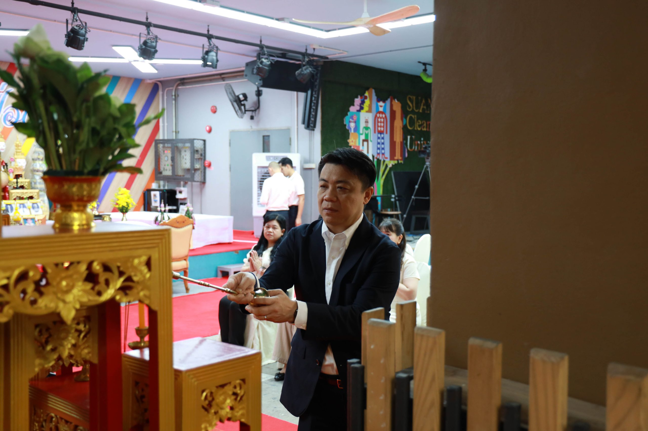 The ceremony concluded with the Krob Kru ritual, conducted to bestow blessings upon administrators, faculty members, parents, and attendees. The ritual included Krop Ching for Thai music students specializing in string instruments and guiding the hand* to strike the gong circle for those studying in the Piphat ensemble, symbolizing auspicious beginnings and the continuation of artistic lineage.