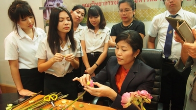 อาจารย์ปริศนา มั่นเภา อาจารย์ประจำหลักสูตรบริหารธุรกิจบัณฑิต สาขาวิชาการบริการลูกค้า คณะวิทยาการจัดการ ดำเนินการจัดโครงการสืบสานศิลปถิ่นวัฒนธรรม กิจกรรมที่ 1 “อนุรักษศิลปะและวัฒนธรรม”ครั้งที่ 2 หัวขอ “ศิลปะการพับดอกบัว” เพื่อรักษาคุณค่าศิลปวัฒนธรรมไทยด้านศิลปะการพับดอกบัว อีกทั้งยังเป็นการฝึกสมาธิและใช้เวลาว่างให้เกิดประโยชน์ โดยมีผู้เข้าร่วมกิจกรรมทั้งนักศึกษา บุคลากร และบุคคลภายนอก ให้ความสนใจในกิจกรรมครั้งนี้ เมื่อวันจันทร์ที่ 24 พฤศจิกายน 2557 ณ ห้อง 1208 อาคาร 1 มหาวิทยาลัยราชภัฏสวนดุสิต