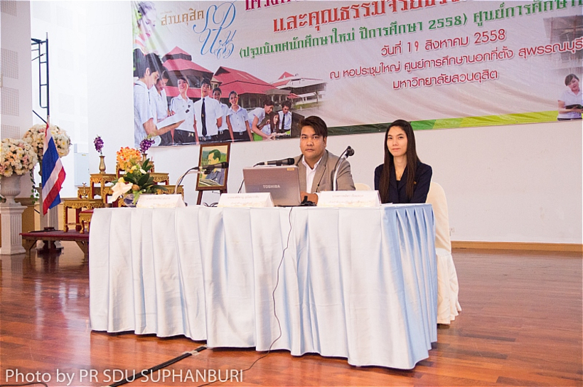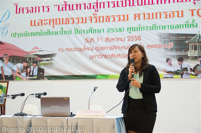 ดร.วราณี  เวชสุนทรเทพ รองอธิการบดีฝ่ายกิจการศูนย์การศึกษา  ให้เกียรติเป็นประธานเปิดงาน และกล่าวให้โอวาทแก่นักศึกษาใหม่ ประจำปีการศึกษา 2558 ในกิจกรรมโครงการ “เส้นทางสู่การเป็นบัณฑิตที่มีคุณภาพ และคุณธรรมจริยธรรม ตามกรอบ TQF” (ปฐมนิเทศนักศึกษาใหม่ ปีการศึกษา 2558) เวลา 08.00-17.00 น. ณ หอประชุมใหญ่ มหาวิทยาลัยสวนดุสิต  ศูนย์การศึกษานอกที่ตั้ง สุพรรณบุรี และมีคณาจารย์จากสาขาต่างๆ เจ้าหน้าที่ของศูนย์การศึกษาเข้าร่วมงาน และชี้แจงกฎระเบียบ ข้อแนะนำต่างๆ ที่นักศึกษาใหม่ควรทราบ เมื่อวันพุธที่ 19 สิงหาคม 2558