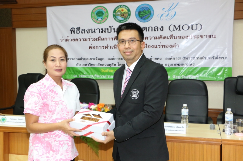 นายณัฐพล แย้มฉิม ประธานดำเนินงานสวนดุสิตโพล มหาวิทยาลัยสวนดุสิต พร้อมด้วย นายกฤษณะ ก้อนแก้ว นายกองค์การบริหารส่วนตำบลเขาเจ็ดลูก อำเภอทับคล้อ จังหวัดพิจิตร , นางสาวฉัตรนภา เมืองแป้น นายกองค์การบริหารส่วนตำบลท้ายดง อำเภอวังโป่ง จังหวัดเพชรบูรณ์ และนายฝ้าย มหาสัตย์ องค์การบริหารส่วนตำบลวังโพรง อำเภอเนินมะปราง จังหวัดพิษณุโลก ลงนามบันทึกข้อตกลงความร่วมมือในการร่วมกันศึกษาและสำรวจความคิดเห็นของประชาชนต่อการดำเนินกิจการเหมืองทองคำ ณ ห้องประชุมองค์การบริหารส่วนตำบลเขาเจ็ดลูก อำเภอทับคล้อ จังหวัดพิจิตร วันอังคารที่ 11 ตุลาคม 2559