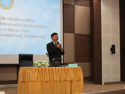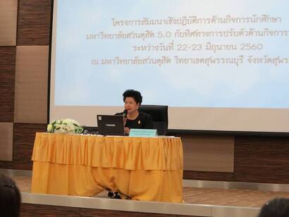 รองศาสตราจารย์ ดร.ศิโรจน์ ผลพันธิน มอบหมายให้ ผู้ช่วยศาสตราจารย์ ดร.พิทักษ์ จันทร์เจริญ รองอธิการบดีฝ่ายบริหาร เป็นประธานในพิธีเปิดงานและบรรยายพิเศษ โครงการสัมมนาเชิงปฏิบัติการด้านกิจการนักศึกษา หัวข้อ มหาวิทยาลัยสวนดุสิต 5.0 กับทิศทางการปรับตัวด้านกิจการนักศึกษา โดยมีผู้ทรงคุณวุฒิร่วมเป็นวิทยากรบรรยายดังต่อไปนี้ ดร.สุวมาลย์ ม่วงประเสริฐ รองอธิการบดีฝ่ายวิชาการ หัวข้อ “วิชาการ + กิจกรรมนักศึกษา” รองศาสตราจารย์พัชรี สวนแก้ว รองอธิการบดีฝ่ายกิจการนักศึกษา หัวข้อ “กิจกรรมสรรค์สร้าง” ดร.จิรวัฒน์ วีรังกร ที่ปรึกษาด้านกิจการนักศึกษา กองพัฒนานักศึกษา มหาวิทยาลัยสวนดุสิต หัวข้อ “มหาวิทยาลัยสวนดุสิต 5.0 กับทิศทางการปรับตัวด้านกิจการนักศึกษา” อาจารย์ชนะ กร่ำกระโทก ผู้อำนวยการฝ่ายพัฒนาหลักสูตร ศูนย์ฝึกอบรมสู่ความเป็นเลิศ เป็นวิทยากรกิจกรรมกลุ่มสัมพันธ์ และ ดร.กิ่งกาญจน์ ทองงอก หัวข้อ “SDU QA กับงานด้านกิจกรรมนักศึกษา” ระหว่างวันที่ 22 – 23 มิถุนายน 2560 ณ ห้องประชุม ดร.สุขุม เฉลยทรัพย์ ชั้น 4 อาคาร ดร.สุขุม เฉลยทรัพย์ มหาวิทยาลัยสวนดุสิต วิทยาเขตสุพรรณบุรี