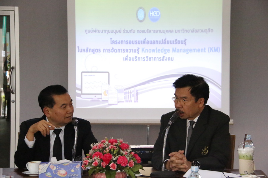 รองศาสตราจารย์ ดร.สุขุม เฉลยทรัพย์ ประธานที่ปรึกษาอธิการบดี และ ผู้ช่วยศาสตราจารย์ ดร.ผดุง พรมมูล ผู้อำนวยการศูนย์พัฒนาทุนมนุษย์ เป็นประธานในการประชุมโครงการอบรมแลกเปลี่ยนเรียนรู้ หลักสูตรการจัดการความรู้(Knowledge Management) เพื่อบริการวิชาการสังคม ในหัวข้อ “คนสวนดุสิต คุยกันบ้างสิ” วันที่ 4 กรกฏาคม 2560 ณ ห้องประชุมชั้น 1 ศูนย์พัฒนาทุนมนุษย์ อาคาร ดร.ศิโรจน์ ผลพันธิน