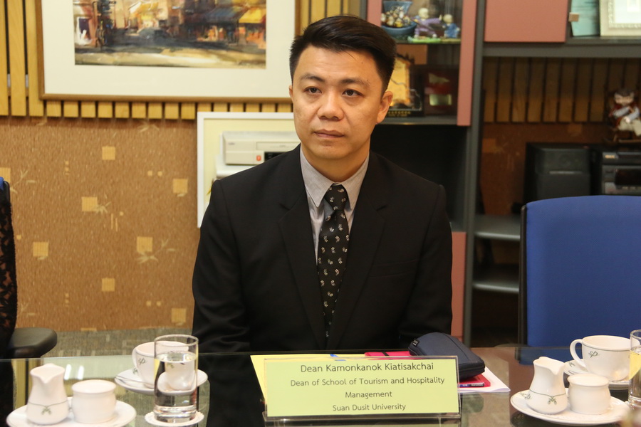ดร.พรชณิตว์ แก้วเนตร รองอธิการบดีฝ่ายกิจการต่างประเทศและลูกค้าสัมพันธ์ พร้อมด้วย รองศาสตราจารย์ พัชรี สวนแก้ว รองอธิการบดีฝ่ายกิจการนักศึกษา, ผู้ช่วยศาสตราจารย์ ดร.ชนะศึก นิชานนท์ รองอธิการบดีฝ่ายวิจัยและพัฒนาการศึกษา, อาจารย์กมลกนก เกียรติศักดิ์ชัย คณบดีโรงเรียนการท่องเที่ยวและการบริการ, ผู้ช่วยศาสตราจารย์ ดร.ยุทธพงษ์ ลีลากิจไพศาล รองคณบดีฝ่ายวิชาการ คณะมนุษยศาสตร์และสังคมศาสตร์, และ อาจารย์ปิยะดา ศรีบุศย์ดี อาจารย์ สังกัดหลักสูตรศิลปศาสตรบัณฑิต สาขาวิชาธุรกิจการโรงแรม โรงเรียนการท่องเที่ยวและการบริการ ให้การต้อนรับผู้บริหารจากมณฑลกวางสี Mr.Cai Wei, Director of Guangxi Tourism Talents Training Centre, Guangxi Committee และคณะผู้บริหารจาก Guilin Tourism University สาธารณรัฐประชาชนจีน และร่วมหารือความร่วมมือในด้านต่างๆ อาทิเช่น ความร่วมมือด้านการวิจัยการท่องเที่ยว, ด้านการแลกเปลี่ยนนักศึกษา และความร่วมมือด้านการพัฒนาบุคลากรด้านการท่องเที่ยวและการบริการ ณ ห้องประชุมสำนักงานมหาวิทยาลัย (เดิม) พร้อมเยี่ยมชม ห้องจำลองฝึกปฏิบัติ (Mock up), Home Bakery มหาวิทยาลัยสวนดุสิต เมื่อวันที่ 22 พฤศจิกายน 2560 (ภาพ ปิยะวัฒน์)