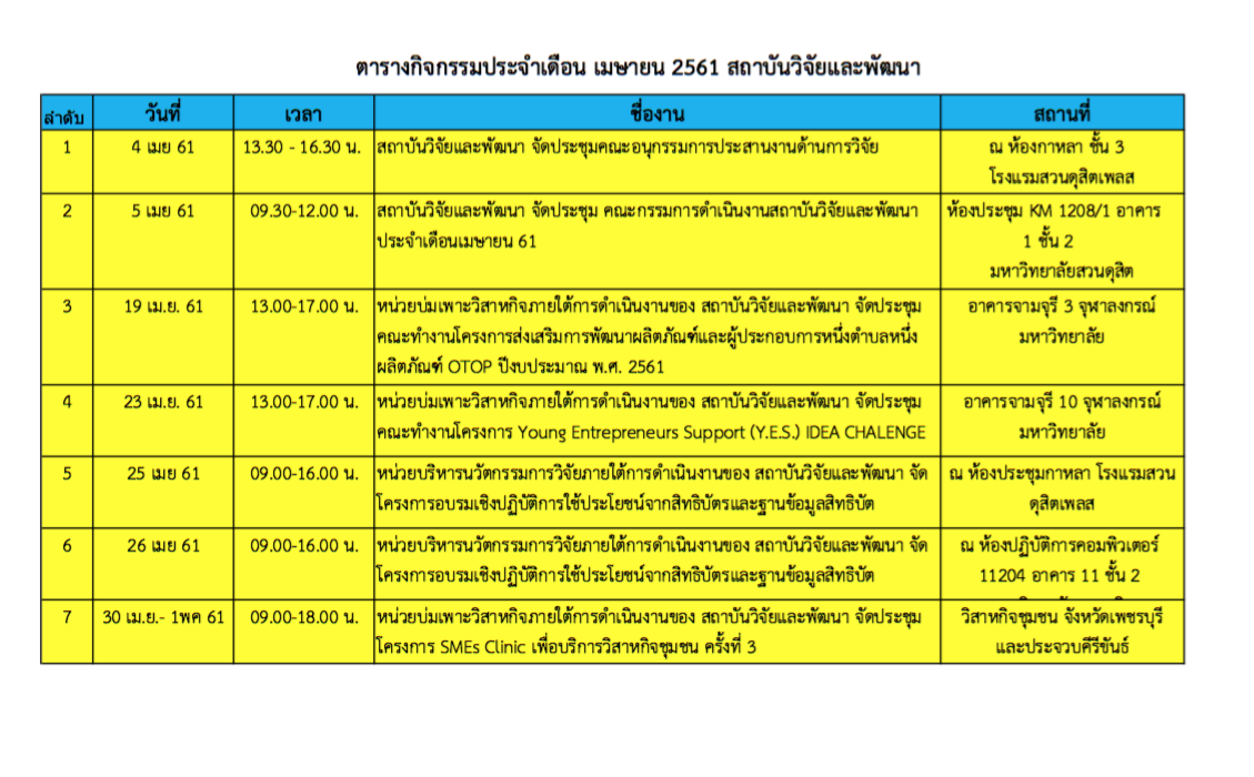 ดาวน์โหลด ตารางกิจกรรม สถาบันวิจัยและพัฒนาประจำเดือนเมษายน 2561