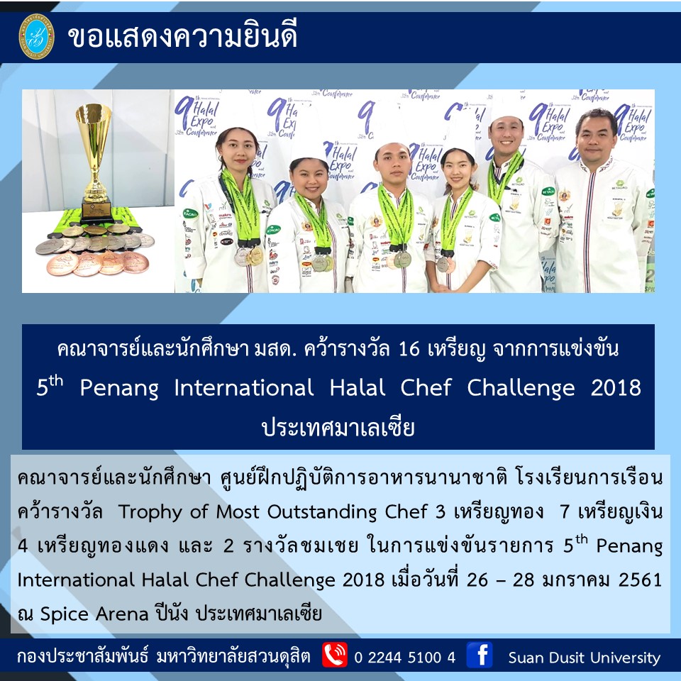 คณาจารย์และนักศึกษา มสด. คว้ารางวัล 16 เหรียญจากการแข่งขัน Penang International Halal Chef Challenge 2018 ประเทศมาเลเชีย