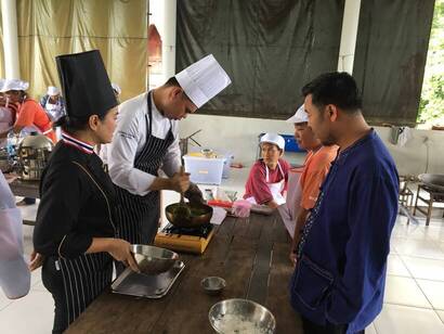 อาจารย์ปภัสมน เวชกิจ อาจารย์ประจำสาขาวิชาคหกรรมศาสตร์ และ อาจารย์ผุสดี ขจรศักดิ์ศิริกุล อาจารย์ประจำสาขาเทคโนโลยีการประกอบอาหารและการบริการ เป็นวิทยากรการฝึกอบรมโครงการเพิ่มศักยภาพผู้มีรายได้น้อยที่ลงทะเบียนสวัสดิการแห่งรัฐ เพื่อสร้างงาน สร้างอาชีพ เพิ่มรายได้และความมั่นคงในชีวิต หลักสูตรการฝึกอบรมอาชีพเสริม สาขา การทำขนมไทย (18 ชั่วโมง) ซึ่งจัดโดยสถาบันพัฒนาฝีมือแรงงานภาค 2 สุพรรณบุรี ในวันที่ 14 – 16 สิงหาคม 2561 เวลา 9.00-16.00 น. ณ วัดสำนักตะฆ่า ตำบลสนามคลี อำเภอเมืองสุพรรณบุรี จังหวัดสุพรรณบุรี