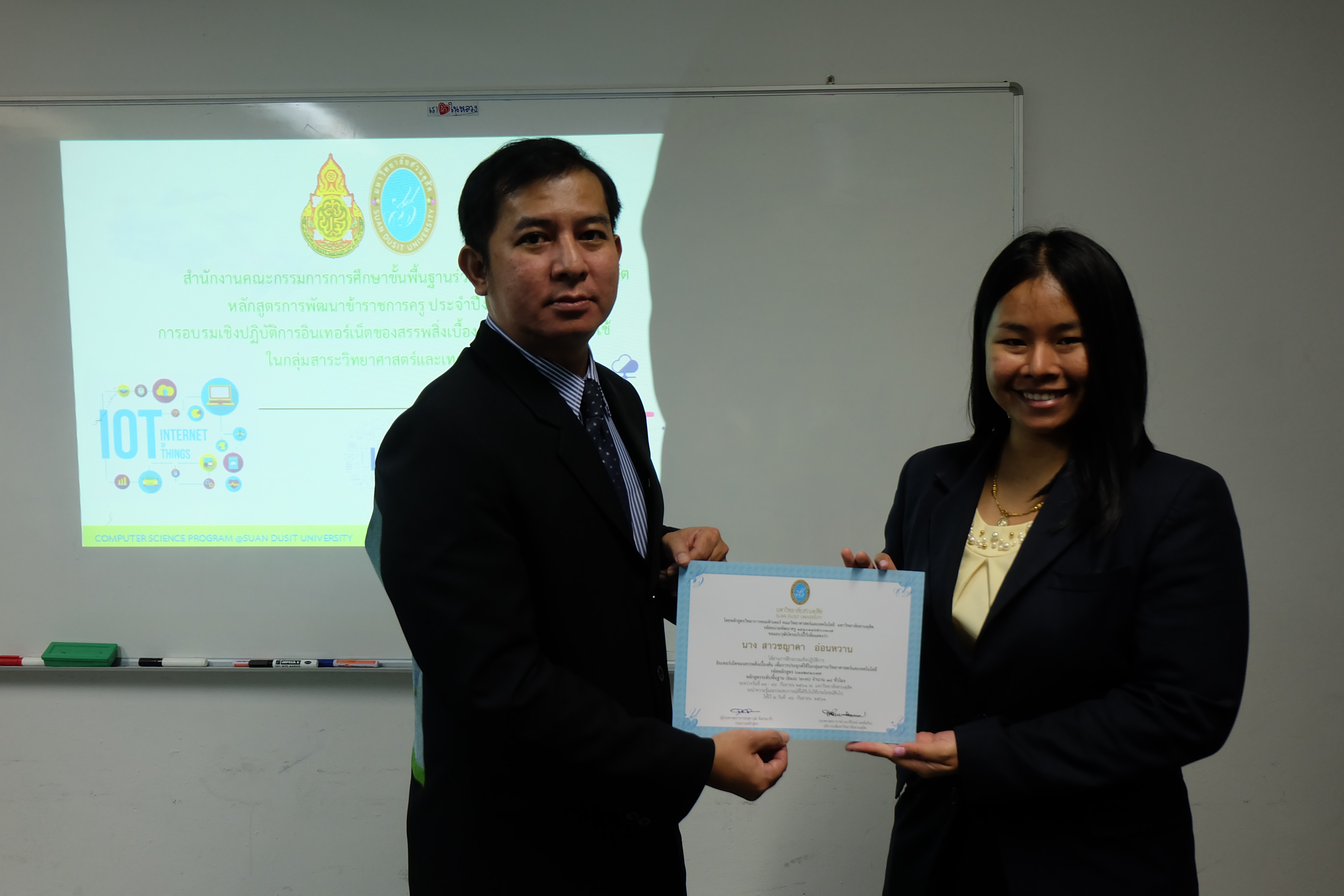 หลักสูตรวิทยาการคอมพิวเตอร์ คณะวิทยาศาสตร์และเทคโนโลยี มหาวิทยาลัยสวนดุสิต ได้จัด การอบรมเชิงปฏิบัติการอินเทอร์เน็ตของสรรพสิ่งเบื้องต้นเพื่อการประยุกต์ใช้ในกลุ่มสาระวิทยาศาสตร์และเทคโนโลยี ในรูปแบบ PLC (Professional Learning Community) หรือชุมชนแห่งการเรียนรู้ทางวิชาชีพ ระหว่างวันที่ 14 – 16 กันยายน 2561 โดยมีวัตถุประสงค์ให้ครูสามารถพัฒนาตนเองได้ตรงตามศักยภาพ สามารถนำความรู้จากการอบรมไปใช้ประโยชน์ได้จริงในการประกอบอาชีพครู อีกทั้งเป็นการพัฒนาครูเพื่อเชื่อมโยงกับวิทยฐานะ ทั้งนี้หลักสูตรดังกล่าวได้รับการับรองจากกระทรวงศึกษาธิการ และดำเนินการอบรมโดย ผู้ช่วยศาสตราจารย์ ดร.ศักดิ์ชัย ยอดมีกลิ่น ผู้ช่วยศาสตราจารย์จุฑาวุฒิ จันทรมาลี และผู้ช่วยศาสตราจารย์ ดร.สุระสิทธิ์ ทรงม้า