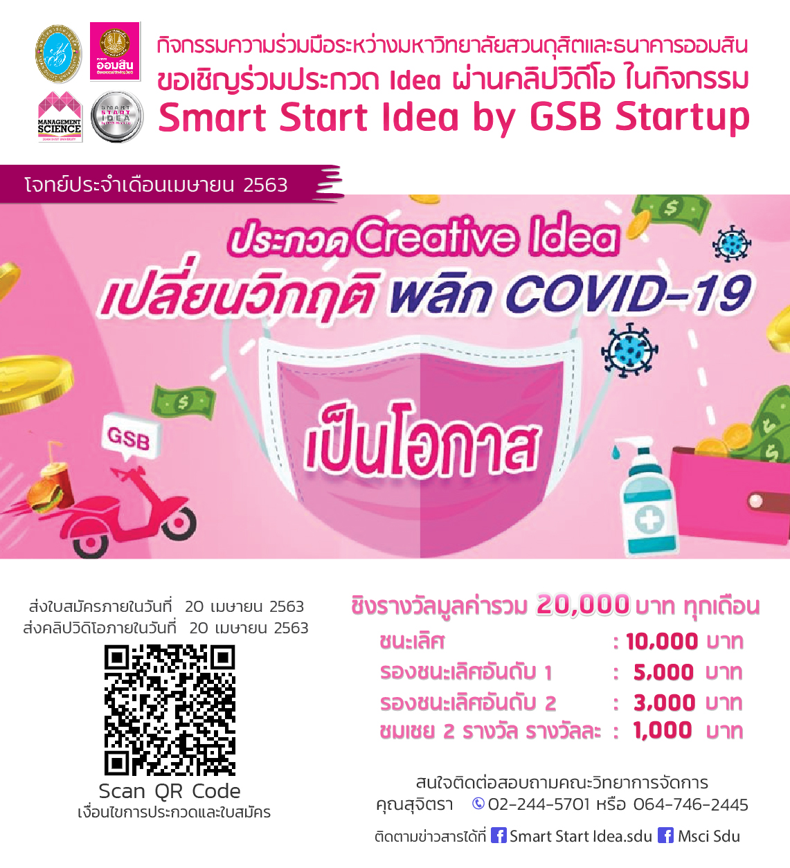 คณะวิทยาการจัดการ มหาวิทยาลัยสวนดุสิตร่วมกับธนาคารออมสิน ขอเชิญร่วมประกวด Idea ผ่านคลิปวิดีโอ ในกิจกรรม Smart Start Idea by GSB Start up ประจำเดือนเมษายน 2563 ในโจทย์ประกวด “Creative Idea เปลี่ยนวิกฤติ พลิก COVID-19 เป็นโอกาส” สามารถส่งใบสมัครได้ภายในวันที่ 20 เมษายน 2563