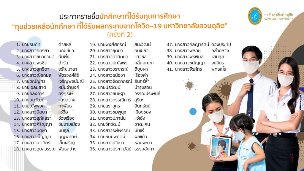 ประกาศรายชื่อนักศึกษาที่ได้รับทุนการศึกษา ทุนช่วยเหลือนักศึกษา ที่ได้รับผลกระทบจากโควิด-19 มหาวิทยาลัยสวนดุสิต (ครั้งที่ 2)