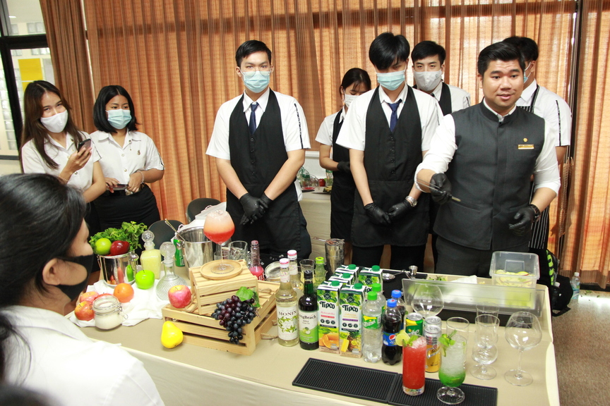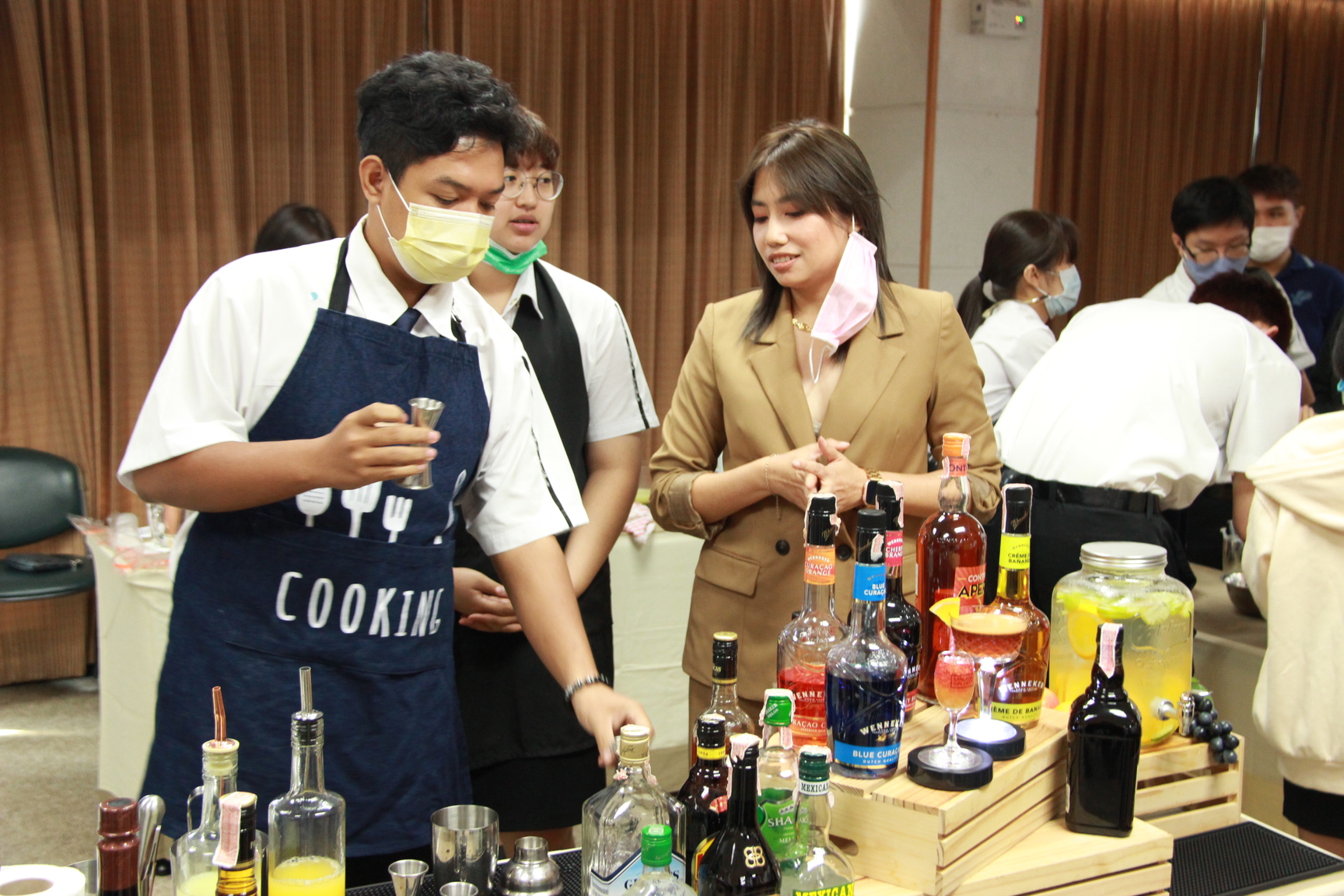 -กิจกรรมสาธิตการทำ Mocktail and Cocktail โดยอาจารย์ธนิกานต์ นับวันดี อาจารย์สาขาอุตสาหกรรมการประกอบอาหาร โรงเรียนการเรือน และนายพุฒิโชติ ทองมอญ เจ้าหน้าที่สำนักงาน (บริหารงานทั่วไป) โรงเรียนการท่องเที่ยวและการบริการ เป็นวิทยากร