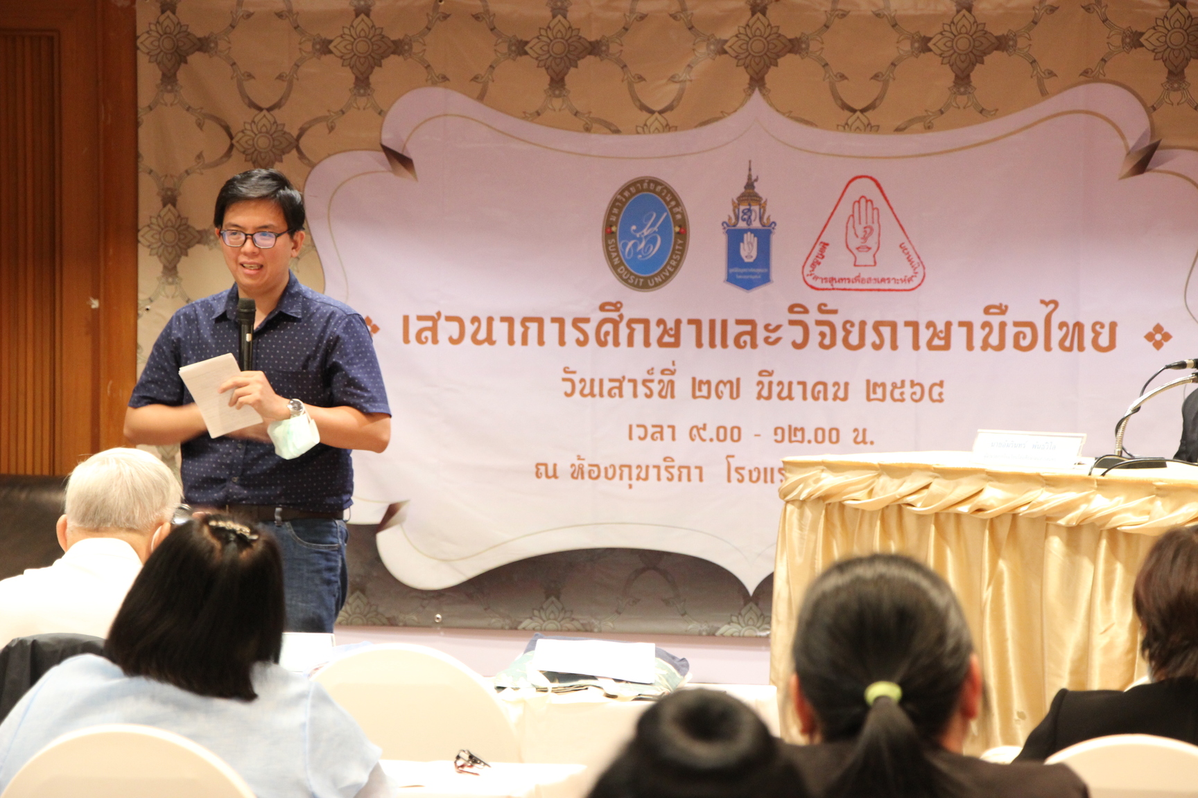 หลักสูตรประกาศนียบัตรบัณฑิต สาขาล่ามภาษามือ มหาวิทยาลัยสวนดุสิต ร่วมกับมูลนิธิอนุเคราะห์คนหูหนวก ในพระบรมราชินูปถัมภ์ และมูลนิธิอนุสารสุนทรเพื่อการสงเคราะห์คนหูหนวกฯ จัดงานเสวนาวิชาการการศึกษาวิจัยภาษามือไทย โดยได้รับเกียรติจาก ดร.สิทธิพร เอี่ยมเสน คณบดีคณะครุศาสตร์ มหาวิทยาลัยสวนดุสิต และนายศุขสนั่น โชติกเสถียร ประธานกรรมการมูลนิธิอนุเคราะห์คนหูหนวก ในพระบรมราชินูปถัมภ์ กล่าวเปิดงาน จากนั้นเป็นการอภิปรายในเรื่องความท้าทายในการสอนภาษามือไทยในโรงเรียนโสตศึกษา และการเสวนาหลักการศึกษาวิจัยและการพัฒนาภาษามือไทย โดยได้รับเกียรติจาก นายอัมรินทร์ พันธ์วิไล ผู้อำนวยการโรงเรียนโสตศึกษาอนุสารสุนทร และดร.สุขสิริ ด่านธนวานิช ร่วมอภิปราย ดำเนินการอภิปราย โดย ดร.มลิวัลย์ ธรรมแสง ประธานหลักสูตรประกาศนียบัตรบัณฑิต สาขาล่ามภาษามือ  และได้รับเกียรติจากนายสมยศ นิมมานเหมินท์ ประธานกรรมการมูลนิธิอนุสารสุนทรเพื่อการสงเคราะห์คนหูหนวกฯ กล่าวปิดงาน งานเสวนาวิชาการการศึกษาวิจัยภาษามือไทย จัดขึ้นเมื่อวันเสาร์ที่ 27 มีนาคม 2564 ณ ห้องกุมาริกา โรงแรมสวนดุสิตเพลส มหาวิทยาลัยสวนดุสิต