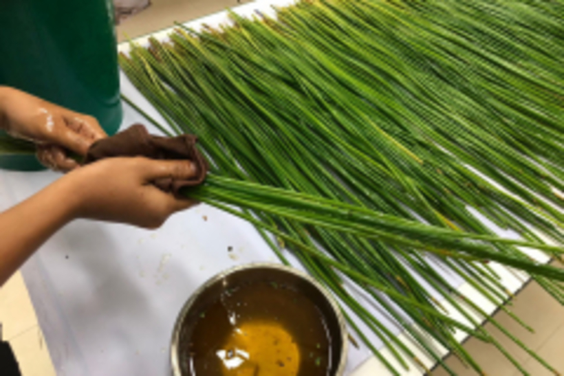 1.ขั้นตอนการเตรียมต้นแห้ว เริ่มจากนำต้นแห้วที่เหลือจากการเก็บเกี่ยวนำมาคัดเลือกขนาดความยาวให้มีขนาดที่เท่ากัน จากนั้นน้ำผ้าชุบน้ำมันพืชชโลมที่ต้นแห้วให้ทั่ว ทิ้งไว้ในร่มให้แห้ง และให้อากาศถ่ายเทได้สะดวกประมาณ 2 วัน จากนั้นชโลมด้วยน้ำมันพืชอีกครั้งหนึ่ง และผึ่งลมให้แห้งอีกประมาณ ๑ สัปดาห์ จากนั้นนำเก็บเพื่อเตรียมการจักสานต่อไป