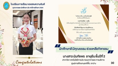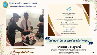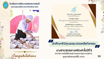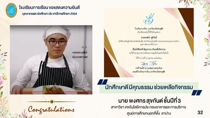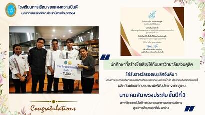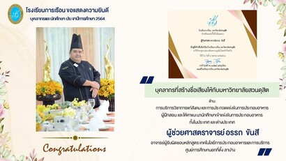 พิธีไหว้ครู ประจำปีการศึกษา 2564 โรงเรียนการเรือน มหาวิทยาลัยสวนดุสิต สาขาวิชาเทคโนโลยีการประกอบอาหารและการบริการ ศูนย์การศึกษานอกที่ตั้ง ลำปาง มหาวิทยาลัยสวนดุสิตในการนี้ ทางสาขาวิชาฯ ร่วมแสดงความยินดีกับผู้ช่วยศาสตราจารย์ อรรถ ขันสีอาจารย์ผู้รับผิดชอบหลักสูตร เทคโนโลยีการประกอบอาหารและการบริการ ศูนย์การศึกษานอกที่ตั้ง ลำปาง ได้รับเกียรติบัตร “บุคลากรที่สร้างชื่อเสียงให้กับมหาวิทยาลัยสวนดุสิตด้านการบริการวิชาการแก่สังคม และการประกวดแข่งขันการประกอบอาหารผู้ฝึกสอน และให้คำแนะนำนักศึกษาเข้าแข่งขันการประกอบอาหารทั้งในประเทศ และต่างประเทศ”พร้อมด้วย อาจารย์ฐิติวรฎา ใยสำลีอาจารย์ผู้รับผิดชอบหลักสูตร เทคโนโลยีการประกอบอาหารและการบริการ ศูนย์การศึกษานอกที่ตั้ง ลำปาง ได้รับเกียรติบัตร “ผู้ที่มีบุคลิกภาพและการแต่งกายเป็นแบบอย่างที่ดีให้แก่นักศึกษา”