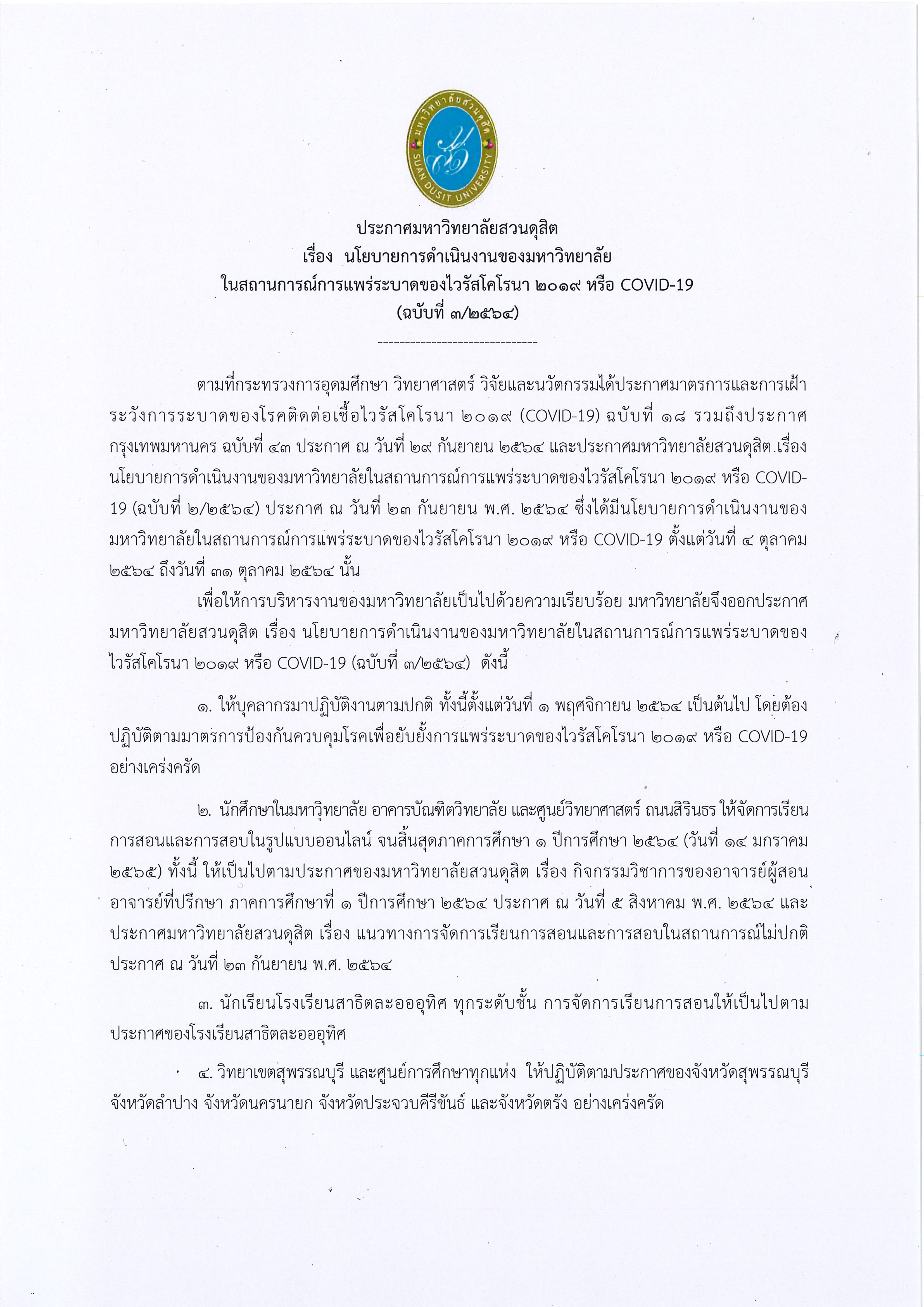 ประกาศมหาวิทยาลัยสวนดุสิต เรื่อง นโยบายการดำเนินงานของมหาวิทยาลัย ในสถานการณ์การแพร่ระบาดของไวรัสโคโรนา 2019 หรือ COVID-19 ฉบับที่ 3/2564