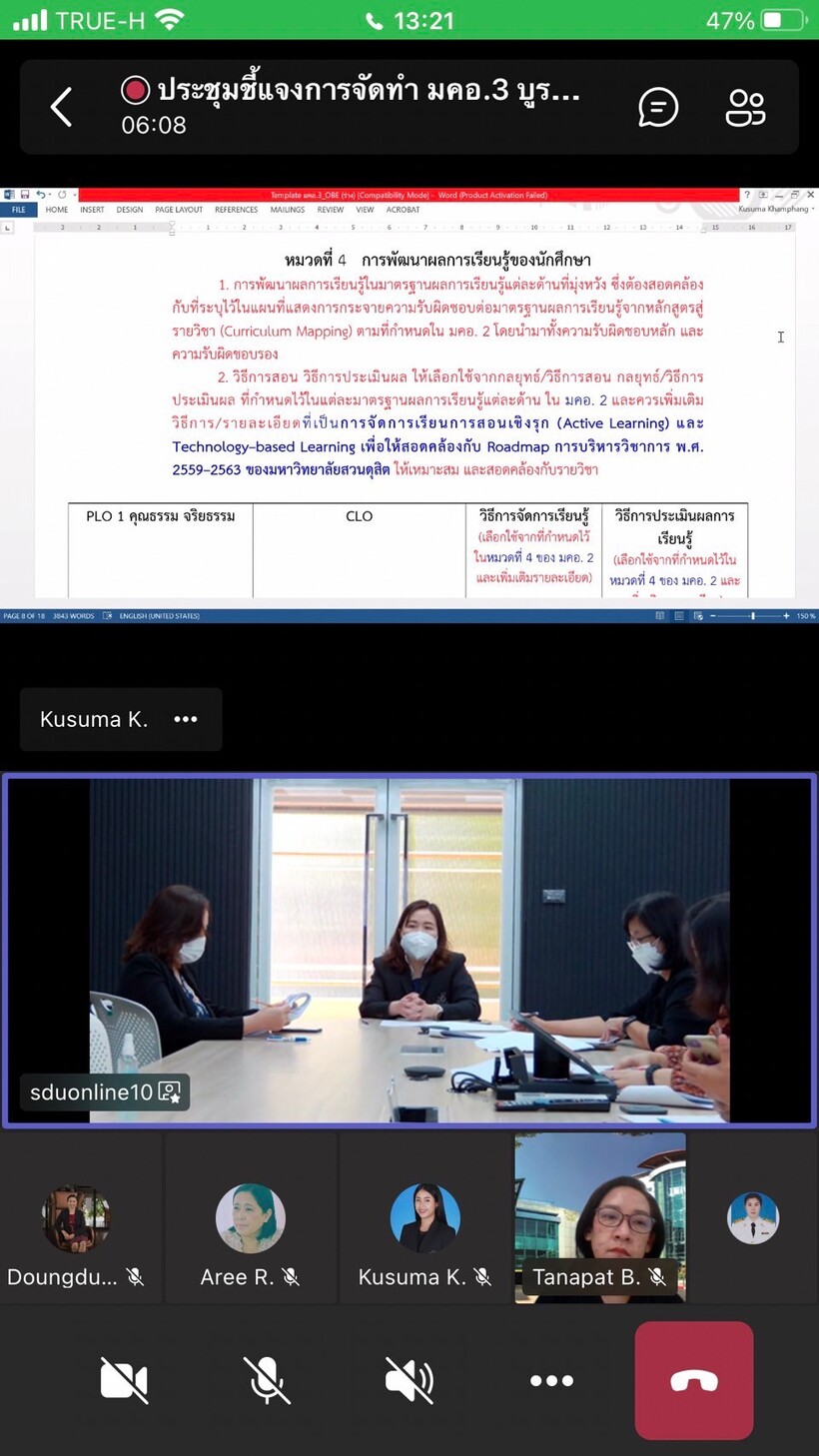 ผู้ช่วยศาสตราจารย์นิศารัตน์ อิสระมโนรส รองคณบดีฝ่ายวิชาการ คณะครุศาสตร์ มหาวิทยาลัยสวนดุสิต เป็นประธานการประชุมพิจารณาการจัดทำ (ร่าง) มคอ.3 บูรณาการ OBE (Outcome – Based Education) ผ่านระบบ Online โปรแกรม Microsoft Teams เมื่อวันอังคารที่ 7 ธันวาคม 2564 เวลา 13.00 – 16.00 น. ณ ห้องประชุม SDU online 10 คณะครุศาสตร์ มหาวิทยาลัยสวนดุสิต