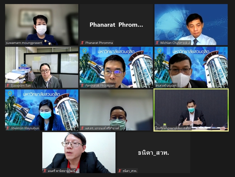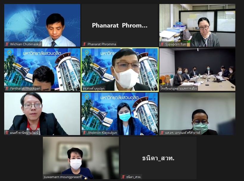 ดร.สุวมาลย์ ม่วงประเสริฐ รองอธิการบดีฝ่ายวิชาการ มหาวิทยาลัยสวนดุสิต เป็นประธานในการประชุมคณะอนุกรรมการกลั่นกรองหลักสูตร หลักสูตรศิลปศาสตรบัณฑิตสาขาวิชากฎหมายมหาชนและการบริหารงานยุติธรรมและ หลักสูตรศิลปศาสตรมหาบัณฑิตสาขาวิชากฎหมายปกครองและการบริหารงานภาครัฐ หลักสูตรใหม่ พ.ศ. 2565 ครั้งที่ 1/2565 ผ่านระบบออนไลน์ Zoom Meeting Applicatio วันที่ 13 มกราคม