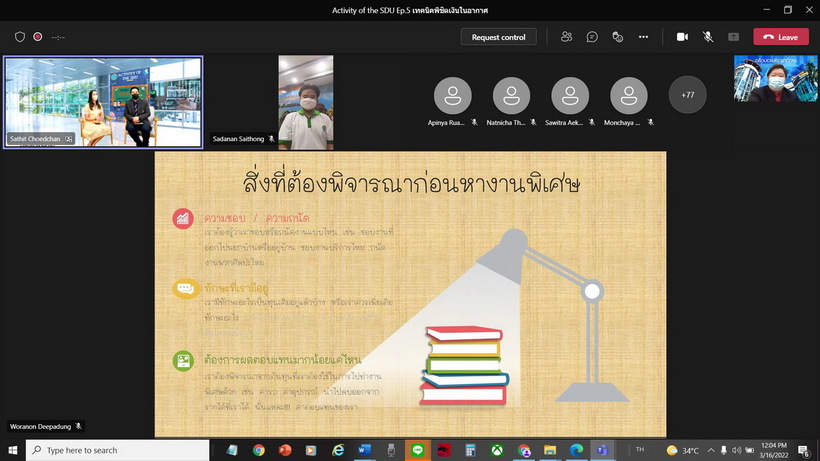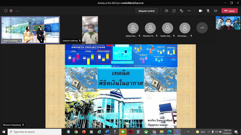 กองพัฒนานักศึกษา  จัดกิจกรรม Activity of The SDU EP.5 เทคนิคพิชิตเงินในอากาศ โดยได้เชิญชวนนักศึกษา  บุคลากร ศิษย์เก่าและประชาชนทั่วไป เข้าร่วมกิจกรรม และได้รับเกียรติจาก ดร.พรภัทร อินทรวรพัฒน์ รองผู้อำนวยการศูนย์พัฒนาทุนมนุษย์ ดร.กัญญทอง หรดาล อาจารย์ประจำหลักสูตรบริหารธุรกิจบัณฑิต สาขาวิชาธุรกิจระหว่างประเทศ ธุรกิจจีน-อาเซียน มาเป็นวิทยากร ในครั้งนี้ ณ ห้อง Online Learning Room 20 อาคาร 11 ชั้น 2 และ ผ่านระบบ Online