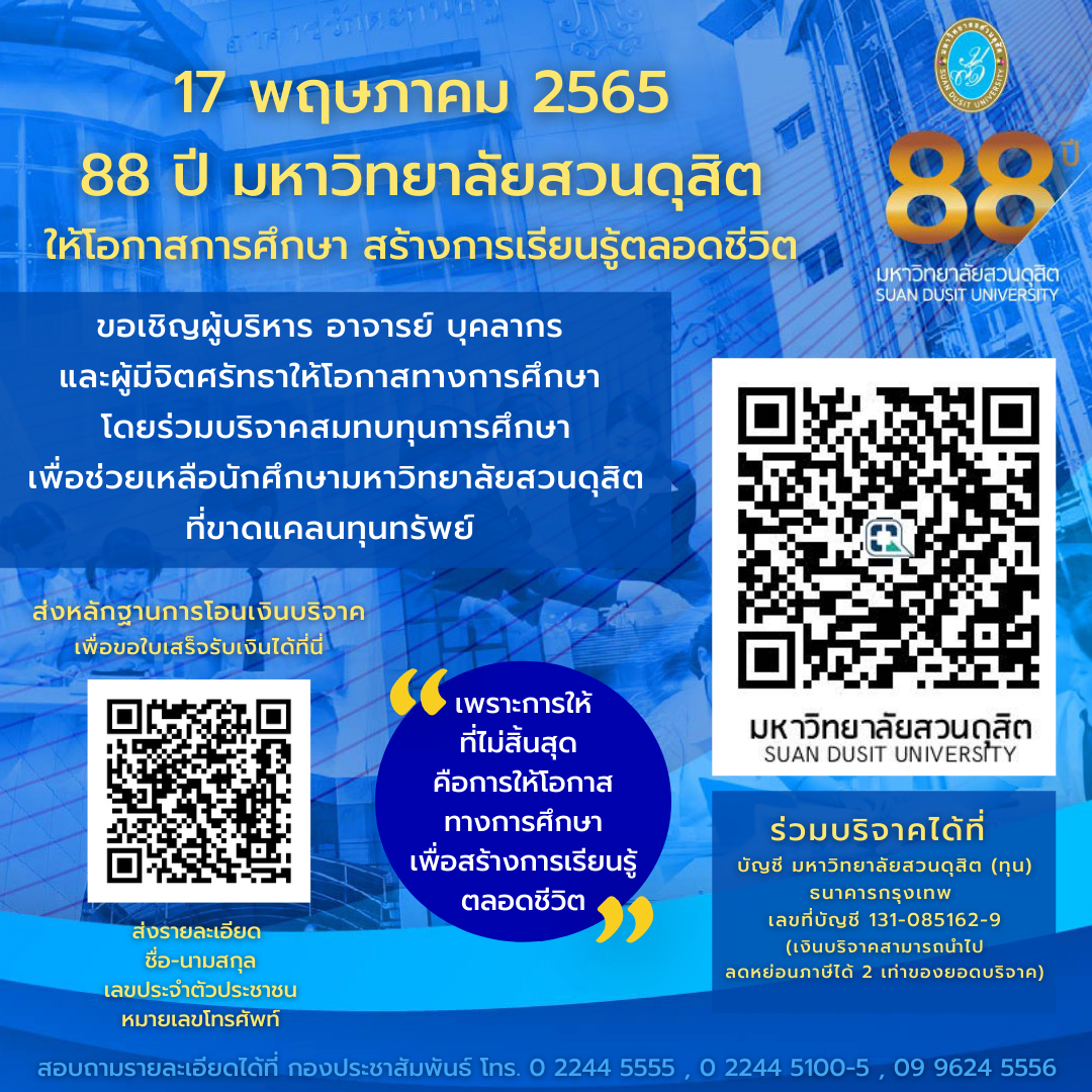 ร่วมบริจาคได้ที่ ชื่อบัญชี มหาวิทยาลัยสวนดุสิต (ทุน)