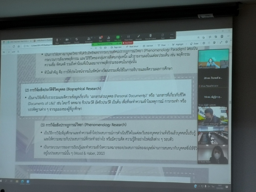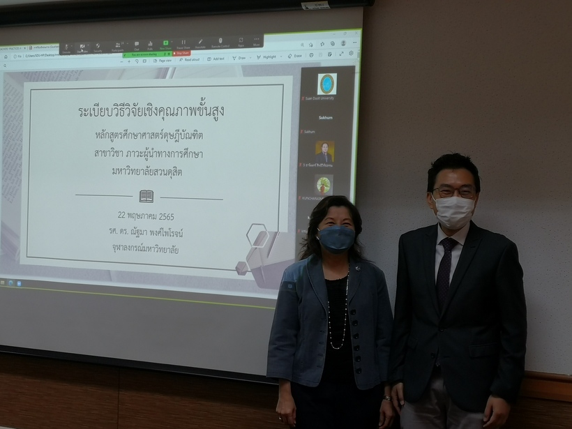หลักสูตรศึกษาศาสตรดุษฎีบัณฑิต สาขาวิชาภาวะผู้นำทางการศึกษา (รุ่น 3) จัดการเรียนการสอนโดย รองศาสตราจารย์ ดร.สุขุม เฉลยทรัพย์ ประธานที่ปรึกษาอธิการบดี มหาวิทยาลัยสวนดุสิต ให้เกียรติแลกเปลี่ยนเรียนรู้ ให้คำปรึกษาและข้อเสนอแนะกับอาจารย์และนักศึกษา แนวคิดและหลักการทำวิจัยเชิงคุณภาพ รายวิชาระเบียบวิธีวิจัยเชิงคุณภาพขั้นสูง จัดการเรียนการสอนและแลกเปลี่ยนเรียนรู้ แบบ Hybrid Learning โดย ดร.พันธรักษ์ ผูกพนธ์ ผู้อำนวยการสถาบันภาษา ศิลปะและวัฒนธรรม และวิทยากรพิเศษ รองศาสตราจารย์ ดร.ณัฐมา พงศ์ไพโรจน์ คณะอักษรศาสตร์ จุฬาลงกรณ์มหาวิทยาลัย ในหัวข้อ “ระเบียบวิธีวิจัยเชิงคุณภาพขั้นสูง” ณ ห้องประชุม 405 บัณฑิตวิทยาลัย มหาวิทยาลัยสวนดุสิต วันอาทิตย์ที่ 22 พฤษภาคม 2565