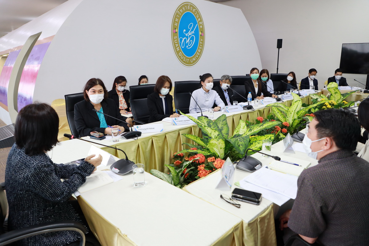 เมื่อวันพฤหัสบดีที่ 26 พฤษภาคม 2565 โรงเรียนการท่องเที่ยวและการบริการ มหาวิทยาลัยสวนดุสิต ได้จัดการประชุมหารือแนวทางร่วมกันเพื่อการพัฒนาศักยภาพอาชีพบัตเลอร์ ระหว่างหลักสูตรศิลปศาสตรบัณฑิต สาขาวิชาธุรกิจการบิน โรงเรียนการท่องเที่ยวและการบริการ มหาวิทยาลัยสวนดุสิต กรมกิจการสตรีและสถาบันครอบครัว กระทรวงการพัฒนาสังคมและความมั่นคงของมนุษย์ กรมการจัดหางาน กระทรวงแรงงาน และ บริษัท โรงแรม เซ็นทรัล พลาซา จำกัด (มหาชน) โดยได้รับเกียรติจาก คุณสุนีย์ ศรีสง่าตระกูลเลิศ รองอธิบดีกรมกิจการสตรีและสถาบันครอบครัว คุณกุรุพิน สิงห์น้อย ผู้อำนวยการกองคุ้มครองและพัฒนาอาชีพ คุณพัชรี ศุภดิษฐ์ ผู้อำนวยการกลุ่มส่งเสริมและพัฒนา และคณะทำงานจากกรมกิจการสตรีและสถาบันครอบครัว กระทรวงการพัฒนาสังคมและความมั่นคงของมนุษย์ คุณบุญยวีร์ ไขว้พันธุ์ รองอธิบดีกรมการจัดหางาน คุณณัฐวุฒิ ภัทรประยูร ผู้อำนวยการกองพัฒนาระบบบริการจัดหางาน และคณะทำงานจากกรมการจัดหางาน กระทรวงแรงงาน คุณสุธาสินี ศุภศิริสินธุ์ คุณศิริวรรณ หวังธำรง คุณสุรศักดิ์ เฉลิมศรี และคณะทำงานจากบริษัท โรงแรม เซ็นทรัล พลาซา จำกัด (มหาชน) หารือร่วมกับ อาจารย์ศริญา ประเสริฐสุด รองคณบดีโรงเรียนการท่องเที่ยวและการบริการ ผู้ช่วยศาสตราจารย์ ดร.อังค์ริสา แสงจำนงค์ ประธานหลักสูตรศิลปศาสตรบัณฑิต สาขาวิชาธุรกิจการบิน อาจารย์นิพนธ์ ระวียัน และ อาจารย์จุฑามาศ เชาว์พิพัฒนะ อาจารย์ประจำหลักสูตรศิลปศาสตรบัณฑิต สาขาวิชาธุรกิจการบิน ณ ห้องปฏิบัติการการบินจำลอง (Mock-up) อาคารเรียนรวม 32 ชั้น 6 มหาวิทยาลัยสวนดุสิต