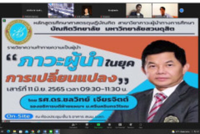 หลักสูตรศึกษาศาสตรดุษฎีบัณฑิต สาขาวิชาภาวะผู้นำทางการศึกษา บัณฑิตวิทยาลัย มหาวิทยาลัยสวนดุสิต จัดบรรยายพิเศษ เรื่อง ภาวะผู้นำในยุคการเปลี่ยนแปลง โดยได้รับเกียรติจาก รศ.ดร.ชลวิทย์ เจียรจิตต์ รองอธิการบดีฝ่ายแผนและยุทธศาสตร์เพื่อสังคม มหาวิทยาลัยศรีนครินทรวิโรฒ เป็นวิทยากร โดยมีผู้บริหาร อาจารย์ บุคลากร และนักศึกษาระดับปริญญาเอก สาขาวิชาภาวะผู้นำทางการศึกษา เข้าร่วมกว่า 100 คน ซึ่งการบรรยายในครั้งนี้เป็นส่วนหนึ่งของการเรียนการสอน ระดับปริญญาเอก สาขาวิชาภาวะผู้นำทางการศึกษา ในรายวิชาความท้าทายความเป็นผู้นำ โดยจัดขึ้น ณ ห้องประชุมชั้น 5 อาคารสำนักงานมหาวิทยาลัย และออนไลน์ผ่าน ZOOM วันเสาร์ที่ 11 มิถุนายน 2565