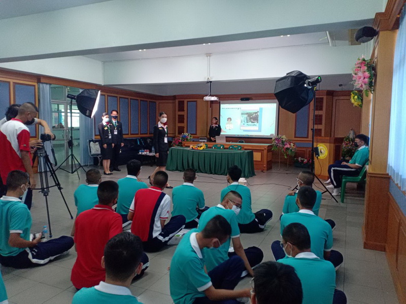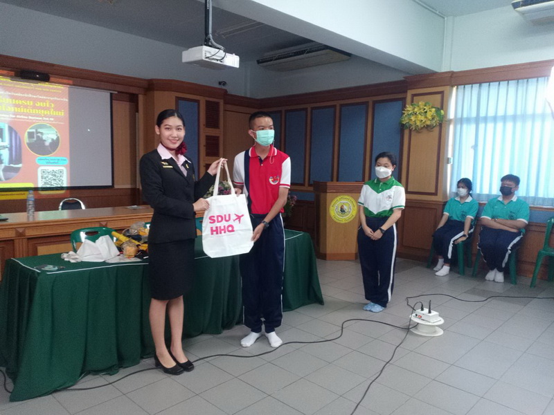มหาวิทยาลัยสวนดุสิต ศูนย์ฯ หัวหิน หลักสูตรศิลปศาสตรบัณฑิต สาขาวิชาธุรกิจการบิน จัดโครงการแนะแนวการศึกษาต่อระดับปริญญาตรี เพื่อประชาสัมพันธ์การรับสมัครนักศึกษาใหม่ ประจำปีการศึกษา 2566 บรรยายหัวข้อ “บุคลิกภาพที่ดีสู่งานด้านบริการ” และสาธิตการใช้อุปกรณ์ความปลอดภัยบนเครื่องบิน เพื่อเป็นแนวทางในการเลือกเส้นทางในอนาคตที่เหมาะกับความถนัด ความสามารถ และศักยภาพของตนเอง ณ โรงเรียนวารีวิทย์สัตหีบ เมื่อวันที่ 27 สิงหาคม 2565