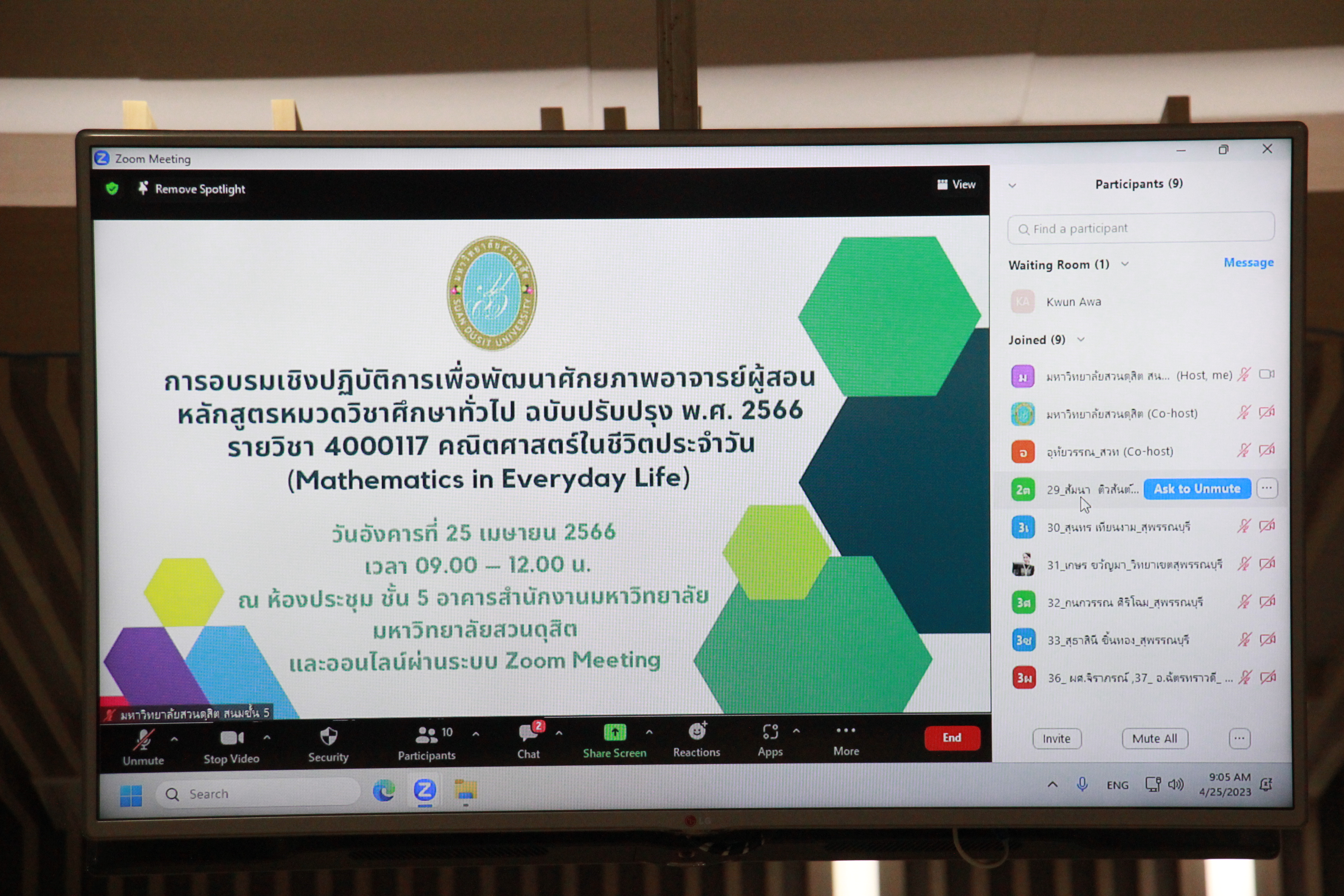 ดร.สวงค์ บุญปลูก รองอธิการบดีฝ่ายเทคโนโลยีสารสนเทศ มหาวิทยาลัยสวนดุสิต เป็นประธานการประชุมอบรมเชิงปฏิบัติการเพื่อพัฒนาศักยภาพอาจารย์ผู้สอนหลักสูตรหมวดวิชาศึกษาทั่วไป ฉบับปรับปรุง พ.ศ. 2566 รายวิชา 4000117 คณิตศาสตร์ในชีวิตประจำวัน โดยมี ผู้บริหาร คณาจารย์ มหาวิทยาลัยสวนดุสิต เข้าร่วมการประชุมดังกล่าว จัดโดย สำนักส่งเสริมวิชาการและงานทะเบียน เมื่อวันที่ 25 เมษายน 2566 เวลา 09.00-12.00 น. ณ ห้องประชุมชั้น 5 อาคารสำนักงานมหาวิทยาลัย และในรูปแบบ Online ผ่านระบบ Zoom Meeting