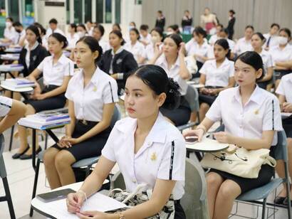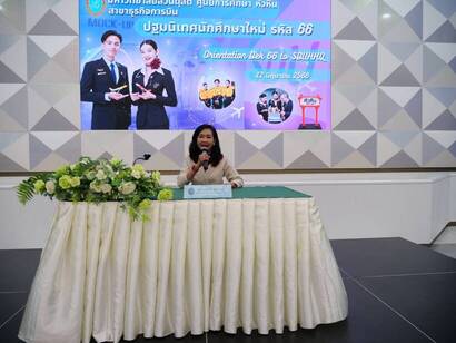 อาคารอเนกประสงค์ธุรกิจการบิน จัดปฐมนิเทศนักศึกษาใหม่ หลักสูตรศิลปศาสตรบัณฑิต สาขาวิชาธุรกิจการบิน ระดับปริญญาตรี ประจำปีการศึกษา 2566 เพื่อให้นักศึกษาใหม่ได้รับทราบเกี่ยวกับการจัดการเรียนการสอน กฏระเบียบต่างๆ โดยได้รับเกียรติจาก ดร.พรชณิตย์ แก้วเนตร รองอธิการบดีฝ่ายกิจการต่างประเทศและลูกค้าสัมพันธ์ กล่าวให้โอวาทและยินดีต้อนรับนักศึกษาใหม่และ นางสาวปรีดา แซ่เล้า ผู้อำนวยการศูนย์การ หัวหิน กล่าวรายงาน เข้าร่วมปฐมนิเทศนักศึกษาใหม่และพบอาจารย์ที่ปรึกษา