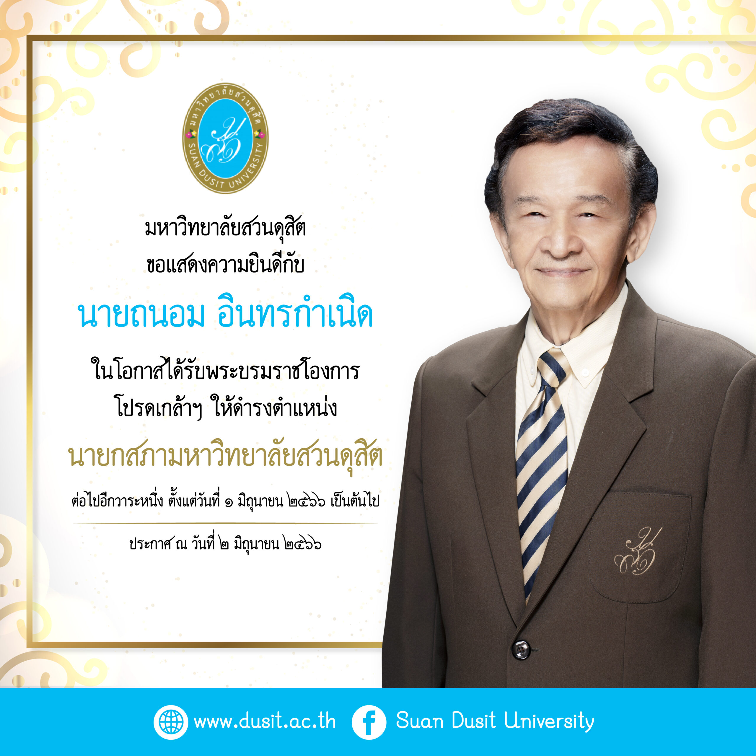 มหาวิทยาลัยสวนดุสิต ขอแสดงความยินดีกับ นายถนอม อินทรกำเนิด ในโอกาสได้รับพระบรมราชโองการโปรดเกล้าฯ ให้ดำรงตำแหน่งนายกสภามหาวิทยาลัยสวนดุสิต