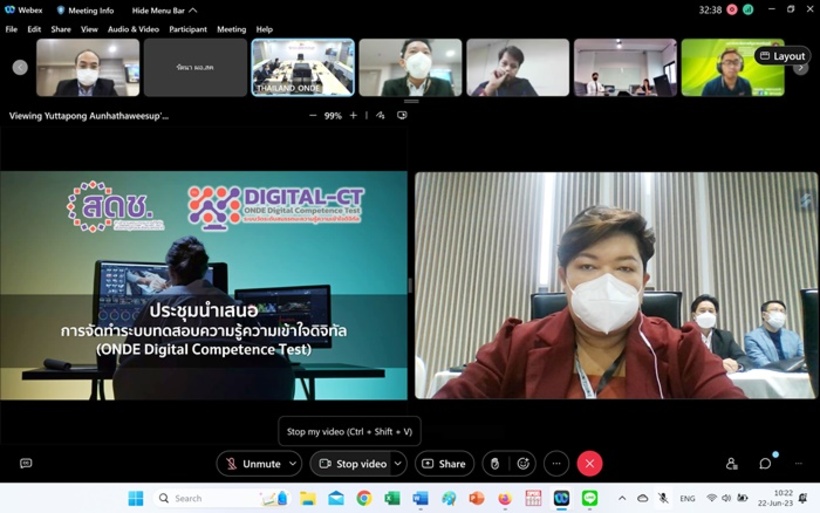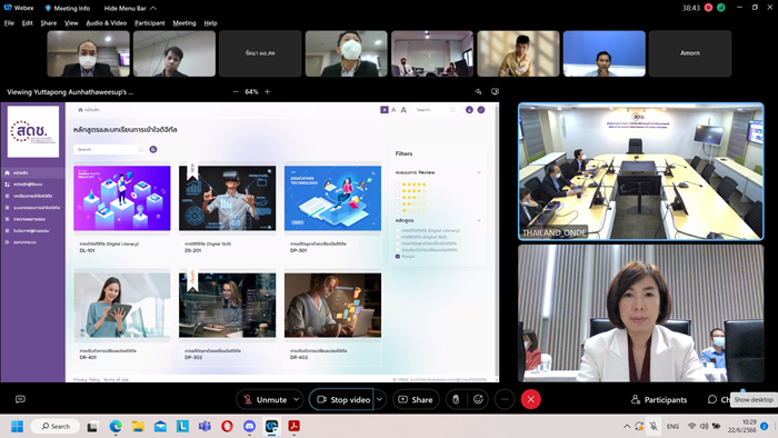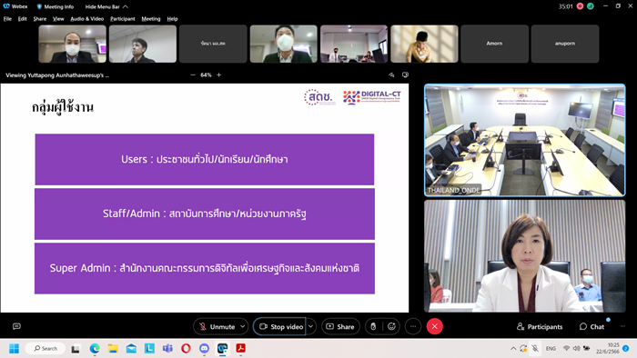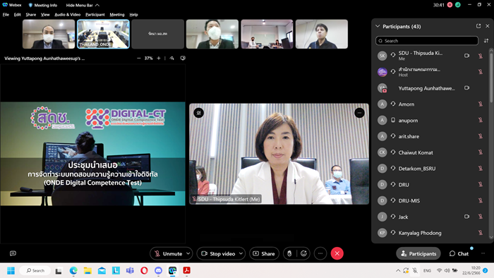 ผู้ช่วยศาสตราจารย์ทิพสุดา คิดเลิศ ผู้อำนวยการสำนักวิทยบริการและเทคโนโลยีสารสนเทศ และ ผู้ช่วยศาสตราจารย์ ดร.เอื้ออารี จันทร หัวหน้าฝ่ายพัฒนาระบบการเรียนรู้ สำนักวิทยบริการฯ เข้าร่วมประชุมการจัดทำระบบวัดระดับสมรรถนะความรู้ความเข้าใจดิจิทัล จัดโดยสำนักงานคณะกรรมการดิจิทัลเพื่อเศรษฐกิจและสังคมแห่งชาติ (สดช.) โดยได้รับเกียรติจาก นางสาวรัตนา จรูญศักดิ์สิทธิ์ ผู้อำนวยการกองขับเคลื่อนดิจิทัลเพื่อสังคม กล่าวเปิดการประชุม การประชุมมีขึ้นเพื่อติดตาม รับฟัง และระดมความคิดเห็นในส่วนของการจัดทำระบบวัดระดับสมรรถนะความรู้ความเข้าใจดิจิทัล ครั้งที่ 1/2566 โดยมีผู้แทนจากมหาวิทยาลัย 39 แห่ง และสมาคมอุตสาหกรรมดิจิทัลไทย เข้าร่วม เมื่อวันพฤหัสบดีที่ 22 มิถุนายน 2566 เวลา 10.00-12.00 น. ในรูปแบบการประชุมผ่านสื่ออิเล็กทรอนิกส์ (Webex)