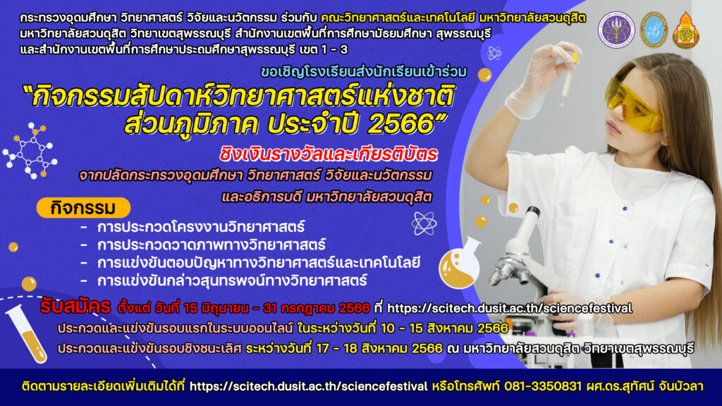 กระทรวงการอุดมศึกษา วิทยาศาสตร์ วิจัยและนวัตกรรม ร่วมกับ มหาวิทยาลัยสวนดุสิต (คณะวิทยาศาสตร์และเทคโนโลยี วิทยาเขตสุพรรณบุรี) สำนักงานเขตพื้นที่การศึกษามัธยมศึกษา สุพรรณบุรี และสำนักงานเขตพื้นที่การศึกษาประถมศึกษาสุพรรณบุรี เขต 1-3 ขอเชิญโรงเรียนส่งนักเรียนเข้าร่วม “กิจกรรมสัปดาห์วิทยาศาสตร์แห่งชาติส่วนภูมิภาค ประจำปี 2566” ชิงเงินรางวัลและเกียรติบัตร