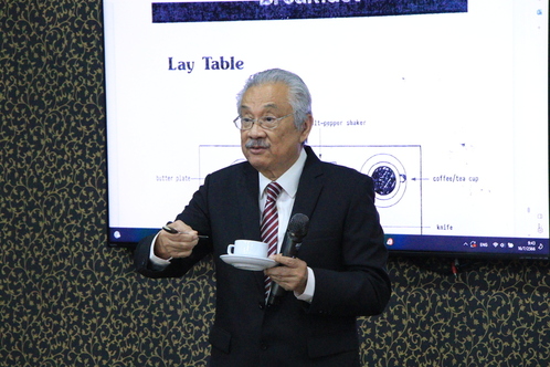 อาจารย์จิระพงศ์ ป้อมน้อย ประธานหลักสูตรธุรกิจการบิน โรงเรียนการท่องเที่ยวและการบริการ พร้อมทีมวิทยากร อาจารย์นิพนธ์ ระวียัน , อาจารย์วินิตา หงส์วรพิพัฒน์ , อาจารย์ภาคภูมิ พันปี อาจารย์สาขาวิชาธุรกิจการบิน และคุณณฐาพัทธ์ พิชญปฐมสิทธิ์ อาจารย์ผู้ช่วยฝึกสอน  ดำเนินการโครงการบัณฑิตพันธุ์ใหม่และกำลังคนที่มีสมรรถนะ เพื่อตอบโจทย์ภาคการผลิตตามนโยบายการปฏิรูปการอุดมศึกษาไทยประเภทประกาศนียบัตร (Non-Degree) กลุ่มอุตสาหกรรมการบริการ รุ่นที่ 2 ประกอบด้วย ศิษย์เก่า ผู้สูงอายุ และเยาวชน เข้าร่วมการอบรมเชิงปฏิบัติการในหัวข้อ “ความรู้ในการจัดโต๊ะอาหาร Table Setting และมารยาทในการบริการบนโต๊ะอาหาร” เพื่อเรียนรู้เกี่ยวกับการจัดโต๊ะอาหารบนเครื่องบินการรับประทานอาหารและเครื่องดื่มบนเครื่องบิน เมื่อวันที่ 16 กรกฎาคม 2566 ณ ห้องปฏิบัติการจำลองบนเครื่องบิน (MOCK UP ROOM) อาคาร 32 ชั้น 6 มหาวิทยาลัยสวนดุสิต