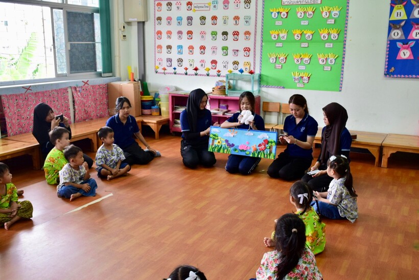 หลักสูตรศึกษาศาสตรบัณฑิต สาขาวิชาการศึกษาปฐมวัย จัดโครงการบูรณาการ “ร้องและเล่านิทานสำหรับเด็กปฐมวัย” จากการบูรณาการรายวิชานิทานและวรรณกรรมภาษาอังกฤษสำหรับเด็กปฐมวัย และรายวิชาดนตรีสำหรับครูปฐมวัย โดยมี ผู้ช่วยศาสตราจารย์นิศารัตน์ อิสระมโนรส และผู้ช่วยศาสตราจารย์อัษฎา พลอยโสภณ เป็นอาจารย์ผู้สอนและนำนักศึกษาระดับชั้นปีที่ 2 เข้าจัดโครงการ เพื่อให้นักศึกษาได้ฝึกปฎิบัติการเล่นดนตรี และการเล่านิทานสำหรับเด็กปฐมวัย ณ ศูนย์พัฒนาเด็กก่อนวัยเรียนพิทักษา เมื่อวันศุกร์ที่ 6 ตุลาคม 2566