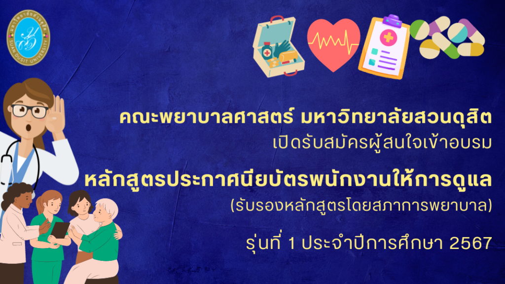 คณะพยาบาลศาสตร์ มหาวิทยาลัยสวนดุสิต เปิดรับสมัครผู้สนใจเข้าอบรมหลักสูตรประกาศนียบัตรพนักงานให้การดูแล รุ่นที่ 1 (รับรองหลักสูตรโดยสภาการพยาบาล) เปิดรับสมัครตั้งแต่บัดนี้ ถึง 28 กุมภาพันธ์ 2567