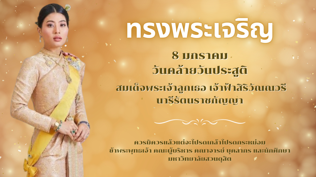 “ทรงพระเจริญ” 8 มกราคม วันคล้ายวันประสูติ สมเด็จพระเจ้าลูกเธอ เจ้าฟ้าสิริวัณณวรี นารีรัตนราชกัญญา ควรมิควรแล้วแต่จะโปรดเกล้าโปรดกระหม่อม ข้าพระพุทธเจ้า คณะผู้บริหาร คณาจารย์ บุคลากร และนักศึกษา มหาวิทยาลัยสวนดุสิต