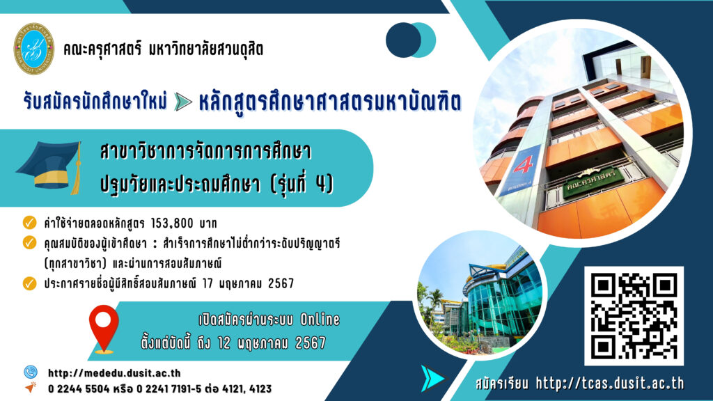 คณะครุศาสตร์ มหาวิทยาลัยสวนดุสิต เปิดรับสมัครบุคคลเข้าศึกษาระดับบัณฑิตศึกษา หลักสูตรศึกษาศาสตรมหาบัณฑิต สาขาวิชาการจัดการการศึกษาปฐมวัยและประถมศึกษา รุ่นที่ 4