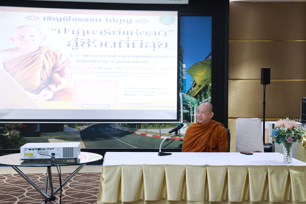 ผู้บริหาร คณาจารย์ บุคลากร และนักศึกษา มหาวิทยาลัยสวนดุสิต ร่วมฟังธรรม ในหัวข้อ ปาฏิหาริย์แห่งสติ” สู่ชีวิตที่มีสุข โดย พระอาจารย์ ดร.เฉลิมพล เกิดมณี วัดตอนธาตุ จ.อุบลราชธานี เมื่อวันที่ 7 มีนาคม 2567 ณ ห้องประชุมลำพอง 1 มหาวิทยาลัยสวนดุสิต และผ่านระบบออนไลน์ Zoom Meeting
