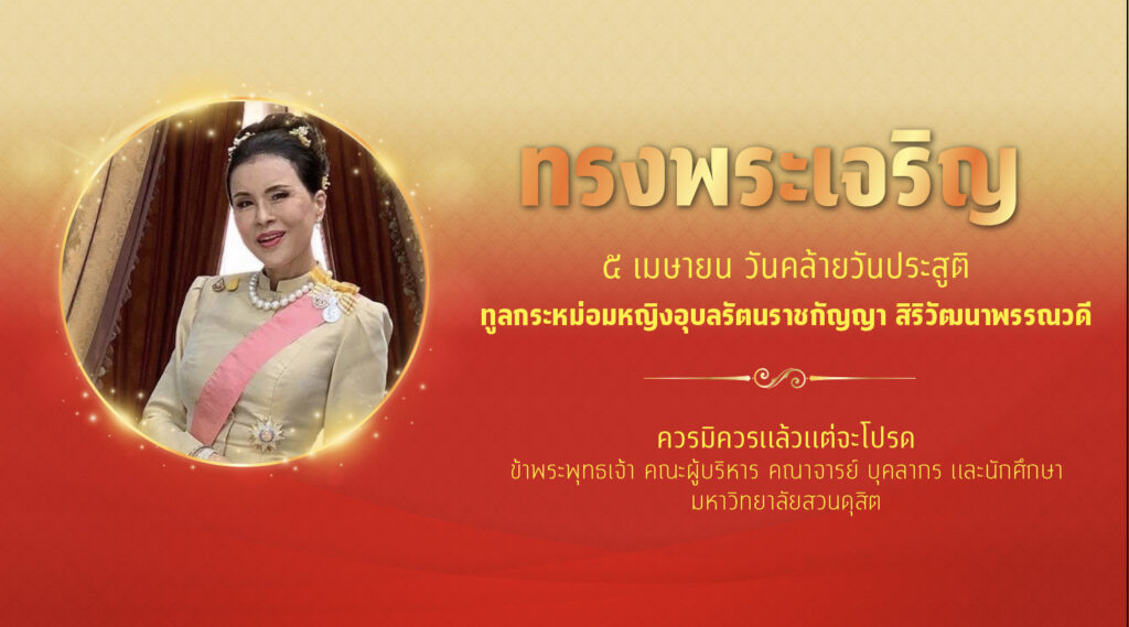 ทรงพระเจริญ ๕ เมษายน วันคล้ายวันประสูติ ทูลกระหม่อมหญิงอุบลรัตนราชกัญญา สิริวัฒนาพรรณวดี ควรมิควรแล้วแต่จะโปรด ข้าพระพุทธเจ้า คณะผู้บริหาร คณาจารย์ บุคลากร และนักศึกษา มหาวิทยาลัยสวนดุสิต