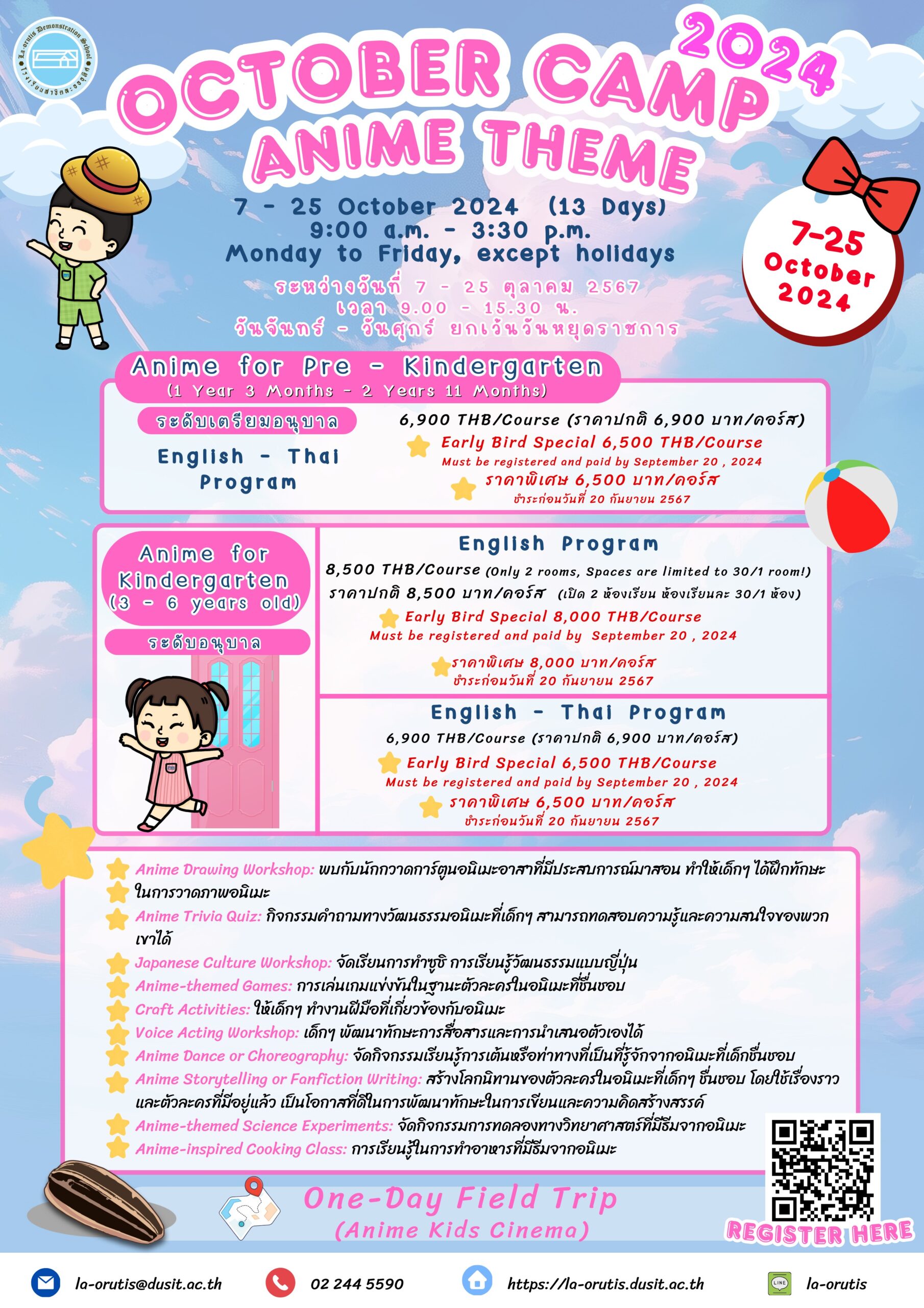 โรงเรียนสาธิตละอออุทิศ มหาวิทยาลัยสวนดุสิต จัดกิจกรรม October Camp 2024 ขอเชิญผู้ปกครองที่สนใจส่งบุตรหลานเข้าร่วมกิจกรรม สอบถามรายละเอียดได้ที่โทร.022445590