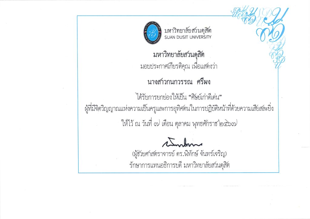 ประกาศมหาวิทยาลัยสวนดุสิต เรื่อง ประกาศให้นางสาวกนกวรรณ ศรีผง ได้รับการยกย่องให้เป็น “ศิษย์เก่าดีเด่น” ผู้ที่มีจิตวิญญาณแห่งความเป็นครูและการอุทิศตนในการปฏิบัติหน้าที่อย่างเสียสละยิ่ง