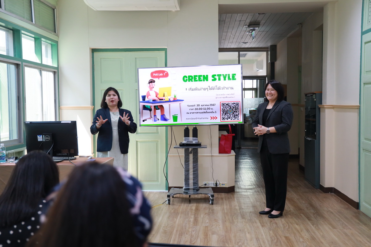 สวนดุสิตโพล จัดกิจกรรม Poll Lab ครั้งที่ 7 “Green Style เริ่มต้นง่ายๆ ได้ที่โต๊ะทำงาน” โดยได้รับเกียรติจาก ดร.พรธิดา เทพประสิทธิ์ ผู้อำนวยการศูนย์สิ่งแวดล้อม เป็นวิทยากรบรรยายเรื่อง Green Style เริ่มต้นง่ายๆ ได้ที่โต๊ะทำงาน และแนะนำแอปพลิเคชัน NetZero Man และแอปพลิเคชัน ZERO CARBON TH เพื่อใช้ในการประเมินการปล่อยก๊าซเรือนกระจกและการชดเชยคาร์บอนจากกิจกรรม เมื่อวันที่ 30 ตุลาคม 2567 ณ อาคารสวนดุสิตโพล