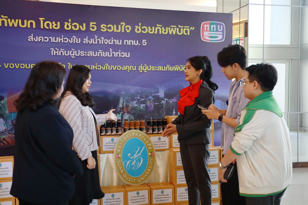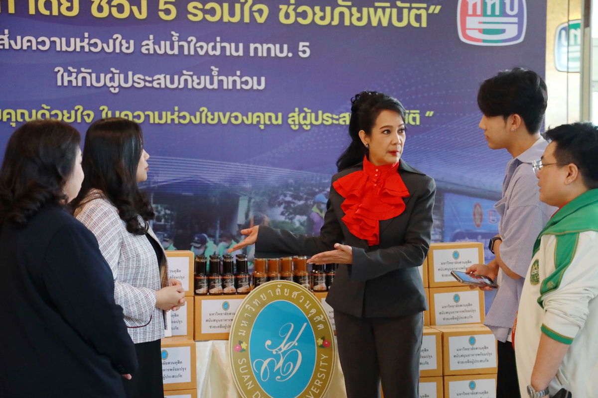 มหาวิทยาลัยสวนดุสิต โดยโครงการปฏิบัติการอาหารแปรรูป ภายใต้ความร่วมมือกับ บริษัท สวนดุสิต เทรดดิ้ง จำกัดร่วมส่งความห่วงใย ส่งน้ำใจผ่าน ททบ. 5 บริจาคอาหารพร้อมปรุงช่วยภัยพิบัติผู้ประสบภัยน้ำท่วม นำโดยผศ.ดร.กนกกานต์ วีระกุล ผู้ช่วยอธิการบดี (ผู้จัดการโครงการปฏิบัติการอาหารแปรรูป) พร้อมด้วย ดร.จันทร์จนา ศิริพันธ์วัฒนา ผู้จัดการสวนดุสิตโฮมเบเกอรี่ เป็นผู้แทนมหาวิทยาลัยสวนดุสิต พร้อมด้วยคณะผู้บริหาร เจ้าหน้าที่ นักศึกษา ร่วมบริจาคอาหารพร้อมปรุงที่มีคุณภาพและปลอดภัย โดยได้รับเกียรติจาก นางสาวทวินันท์ คงคราญ รองผู้อำนวยการใหญ่ด้านการสื่อสารและภาพลักษณ์องค์กร สถานีโทรทัศน์กองทัพบก (ททบ.5) เป็นผู้รับและส่งมอบธารน้ำใจสู่ผู้ประสบภัยน้ำท่วม ภายใต้โครงการ “กองทัพบก โดยช่อง 5 รวมใจ ช่วยภัยพิบัติ” เพื่อช่วยเหลือผู้ประสบภัยน้ำท่วมให้ผ่านวิกฤตการณ์ครั้งนี้ เมื่อวันที่ 25 ธันวาคม 2567 ณ อาคารเบญจารังสฤษฎ์ สถานีวิทยุโทรทัศน์กองทัพบกช่อง 5