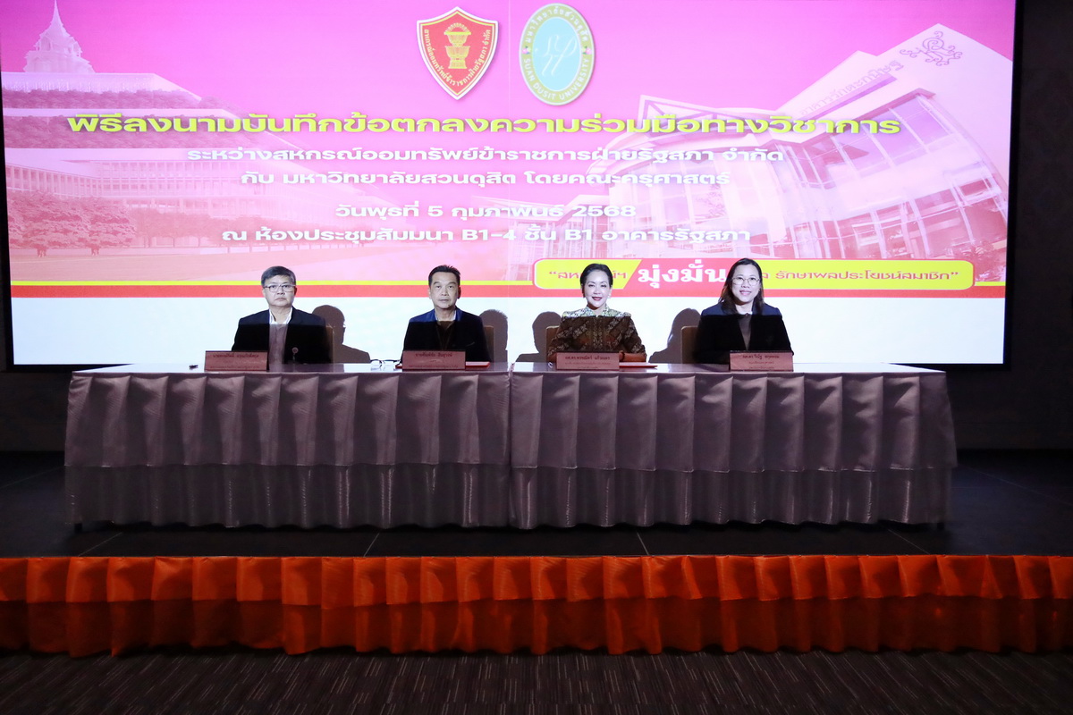 ผศ.ดร.พรชณิตว์ แก้วเนตร รองอธิการบดีฝ่ายวิชาการและกิจการต่างประเทศ และ ผศ.ดร.วีณัฐ สกุลหอม คณบดีคณะครุศาสตร์ ร่วมด้วย ผศ.นิศารัตน์ อิสระมโนรส รองคณบดีฝ่ายวิชาการและการประกันคุณภาพคณะครุศาสตร์ มหาวิทยาลัยสวนดุสิต ผศ.อัษฎา พลอยโสภณ รองคณบดีฝ่ายบริหารและกิจการนักศึกษาคณะครุศาสตร์ พร้อมคณะ ร่วมพิธีลงนามบันทึกข้อตกลงความร่วมมือทางวิชาการ (MOU) กับสหกรณ์ออมทรัพย์ข้าราชการฝ่ายรัฐสภา จำกัด โดยมี นายชาติชาย เนื่องนิยม ประธานอนุกรรมการประชาสัมพันธ์ สหกรณ์ออมทรัพย์ข้าราชการฝ่ายรัฐสภา จำกัด ให้การต้อนรับและร่วมลงนาม MOU ของโครงการพัฒนาความรู้ให้แก่บุตรสมาชิกสหกรณ์ระหว่างปิดภาคเรียน ประจำปี 2568 – Kids Coop Camp ระหว่างเดือนมีนาคม – พฤษภาคม 2568 ประมาณ 47 วัน โดยคณะครุศาสตร์คัดเลือกและส่งนักศึกษา จำนวน 8 คน มาปฏิบัติหน้าที่ครูฝึกสอนดูแลเด็กที่ร่วมโครงการ ซึ่งตรงกับนโยบายการจัดการศึกษาในรูปแบบสหกิจศึกษาและการศึกษาเชิงบูรณาการกับการทำงาน (CWIF) ของคณะ โดยพิธีลงนามดังกล่าวจัดในวันพุธที่ 5 กุมภาพันธ์ 68 ณ ห้องประชุมสัมมนา บี 1-4 ชั้น บี 1 อาคารสหกรณ์ รัฐสภา