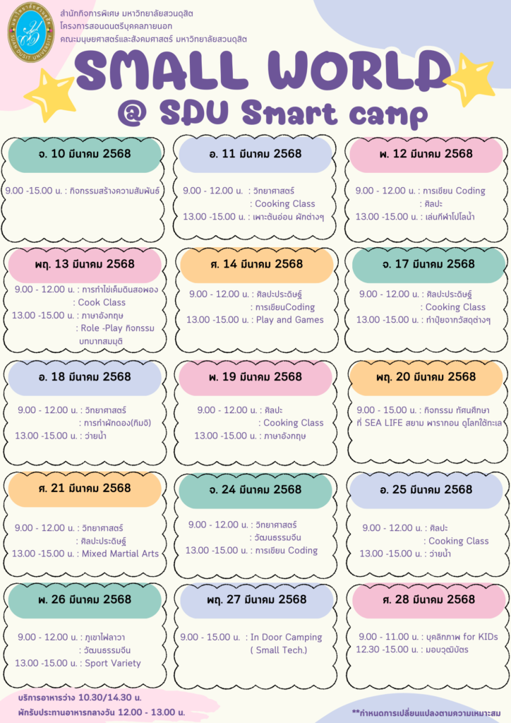 สำนักกิจการพิเศษ ร่วมกับ โครงการสอนดนตรีบุคคลภายนอก คณะมนุษยศาสตร์และสังคมศาสตร์ มหาวิทยาลัยสวนดุสิต เปิดรับสมัครน้อง ๆ อายุ 6-10 ปี เข้าร่วมกิจกรรม SUAN DUSIT SMART CAMP ในธีม Small World ระหว่างวันที่ 10 – 28 มีนาคม 2568 (หยุดวันเสาร์-อาทิตย์)